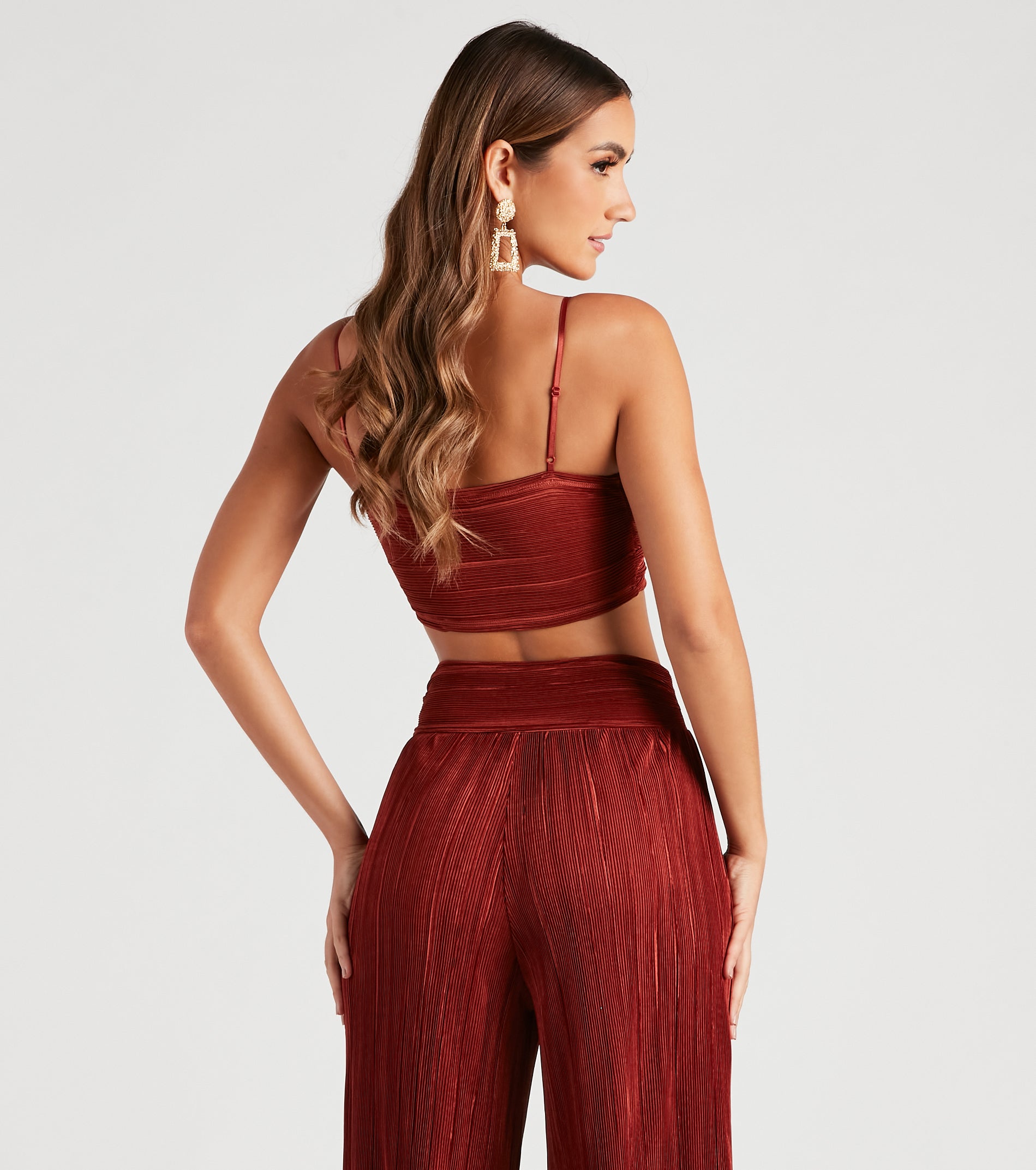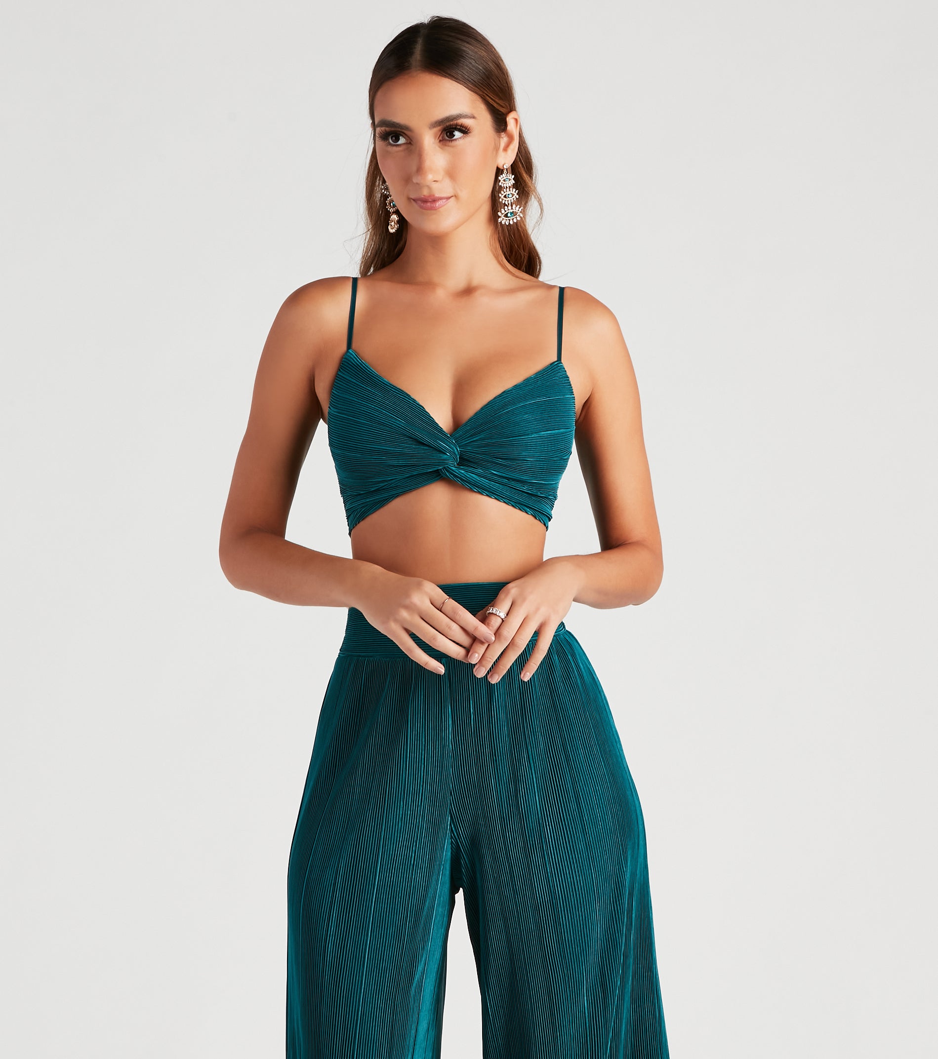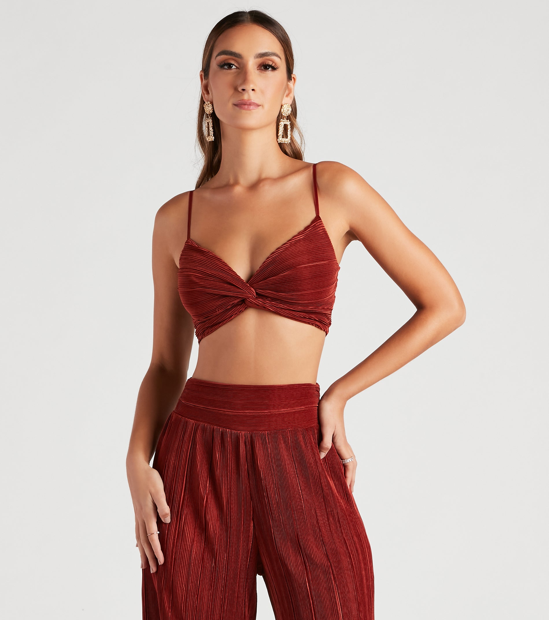 Enter the room of the rhythm and blues! All eyes on you in this saucy crop top featuring a sleeveless. sweetheart neck. adjustable spaghetti straps. and a twisted bust. on pleated-lined fabric. Complete the look in the matching bottoms.
