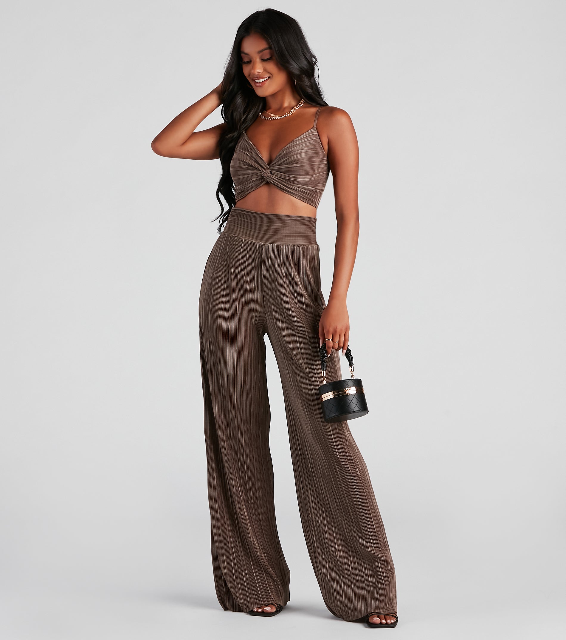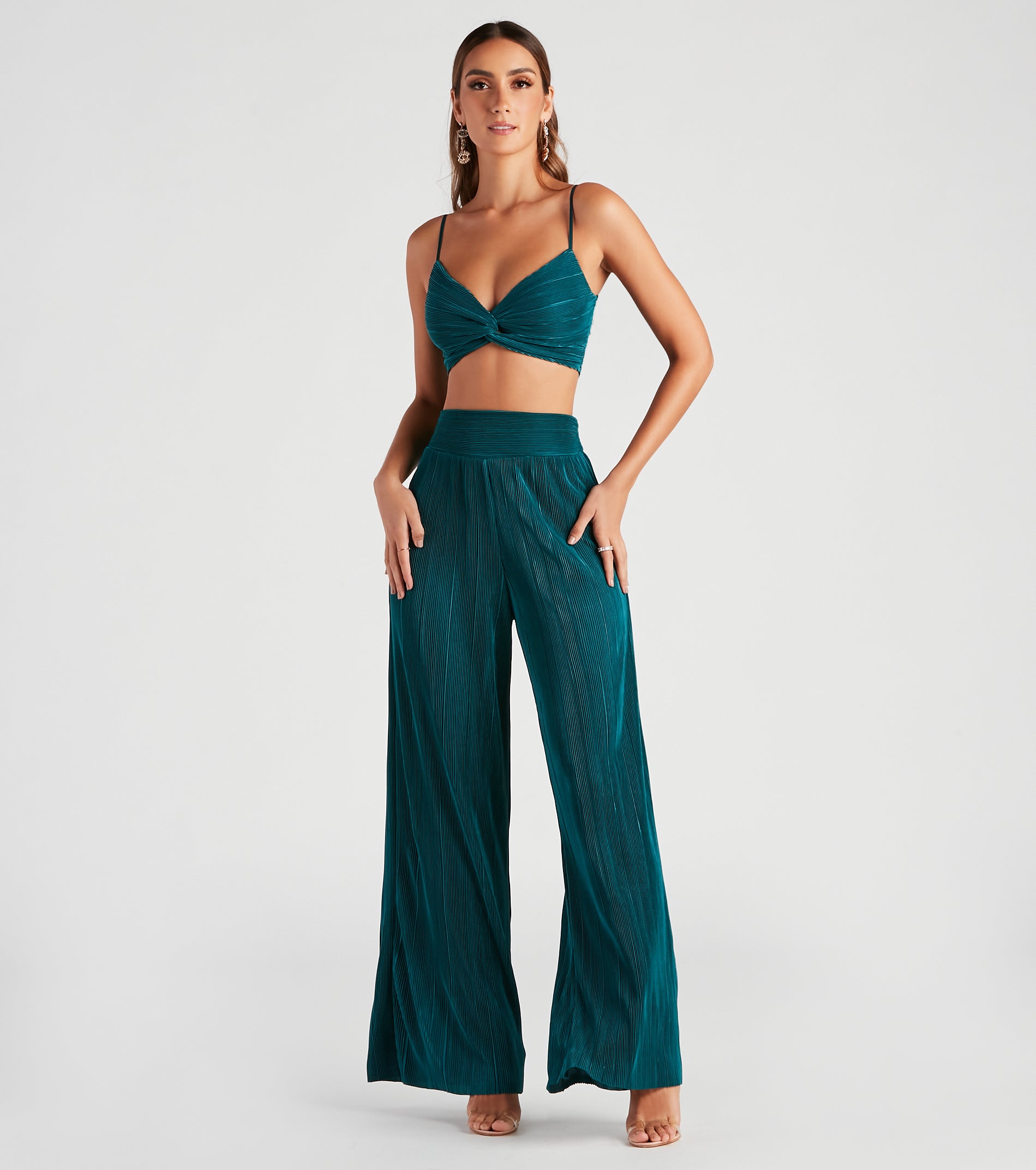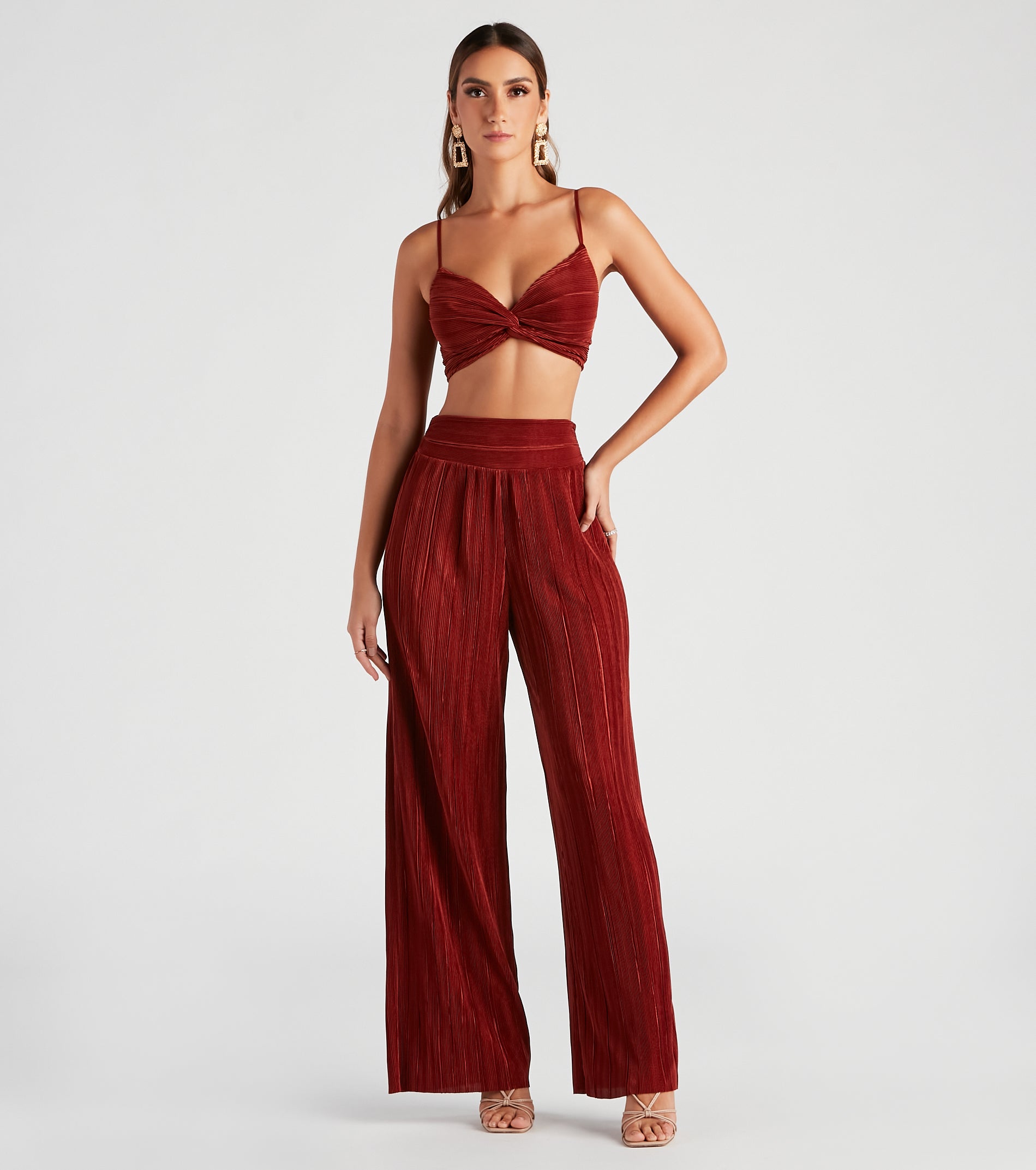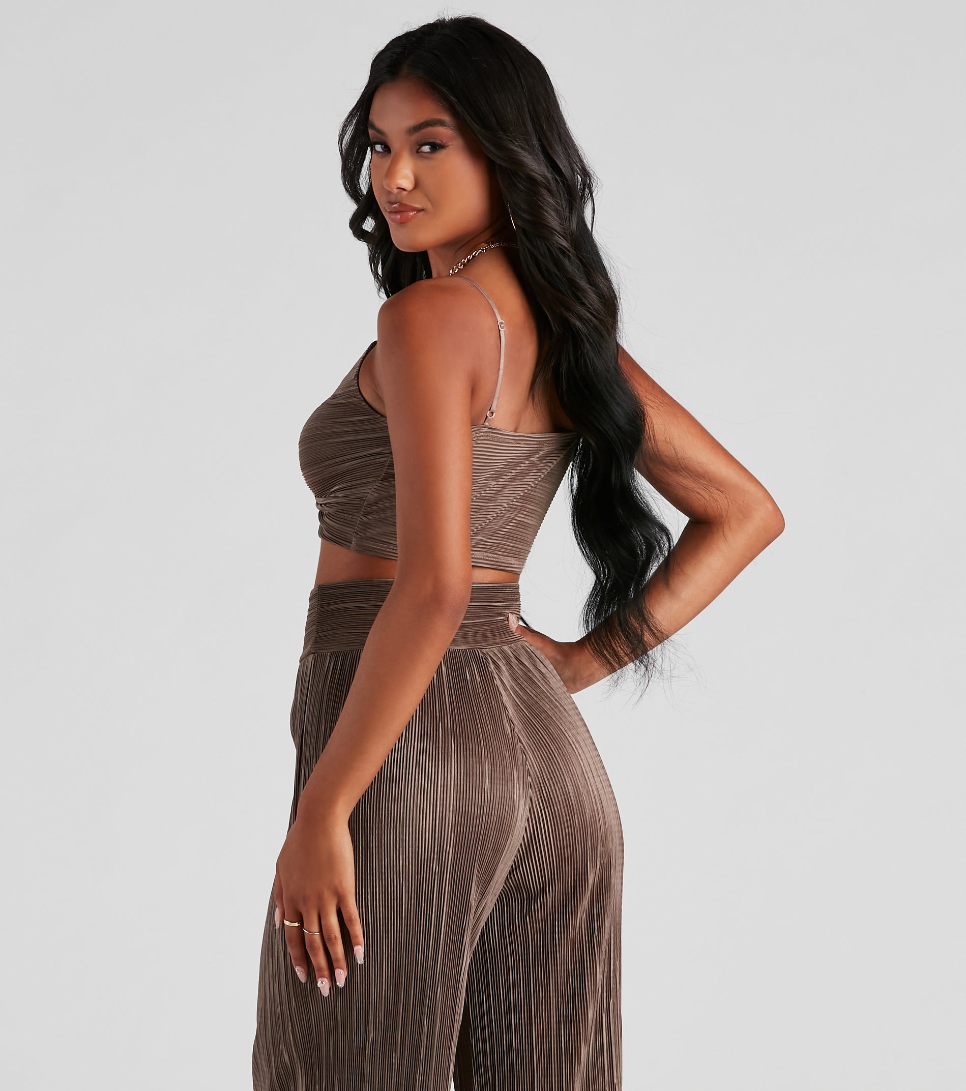 Enter the room of the rhythm and blues! All eyes on you in this saucy crop top featuring a sleeveless. sweetheart neck. adjustable spaghetti straps. and a twisted bust. on pleated-lined fabric. Complete the look in the matching bottoms.