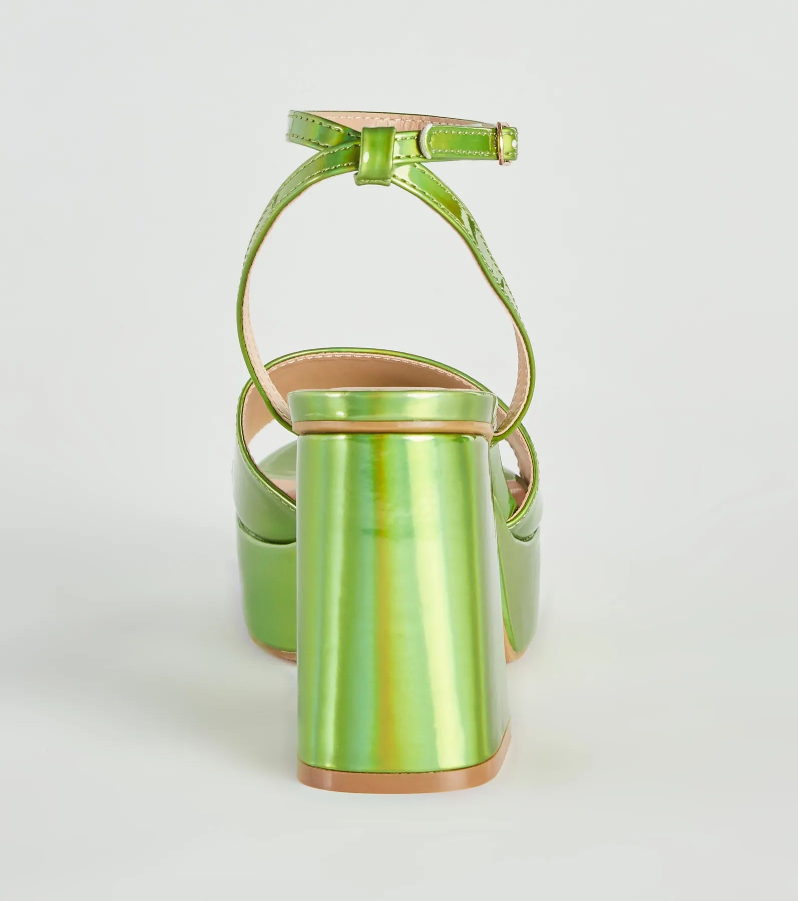 And just like that these chrome platform heels will appear in your cart! They feature an almond toe. wide toe strap. ankle strap with buckle closure. and a block heel. Style with a sassy for a celebration or bachelorette!