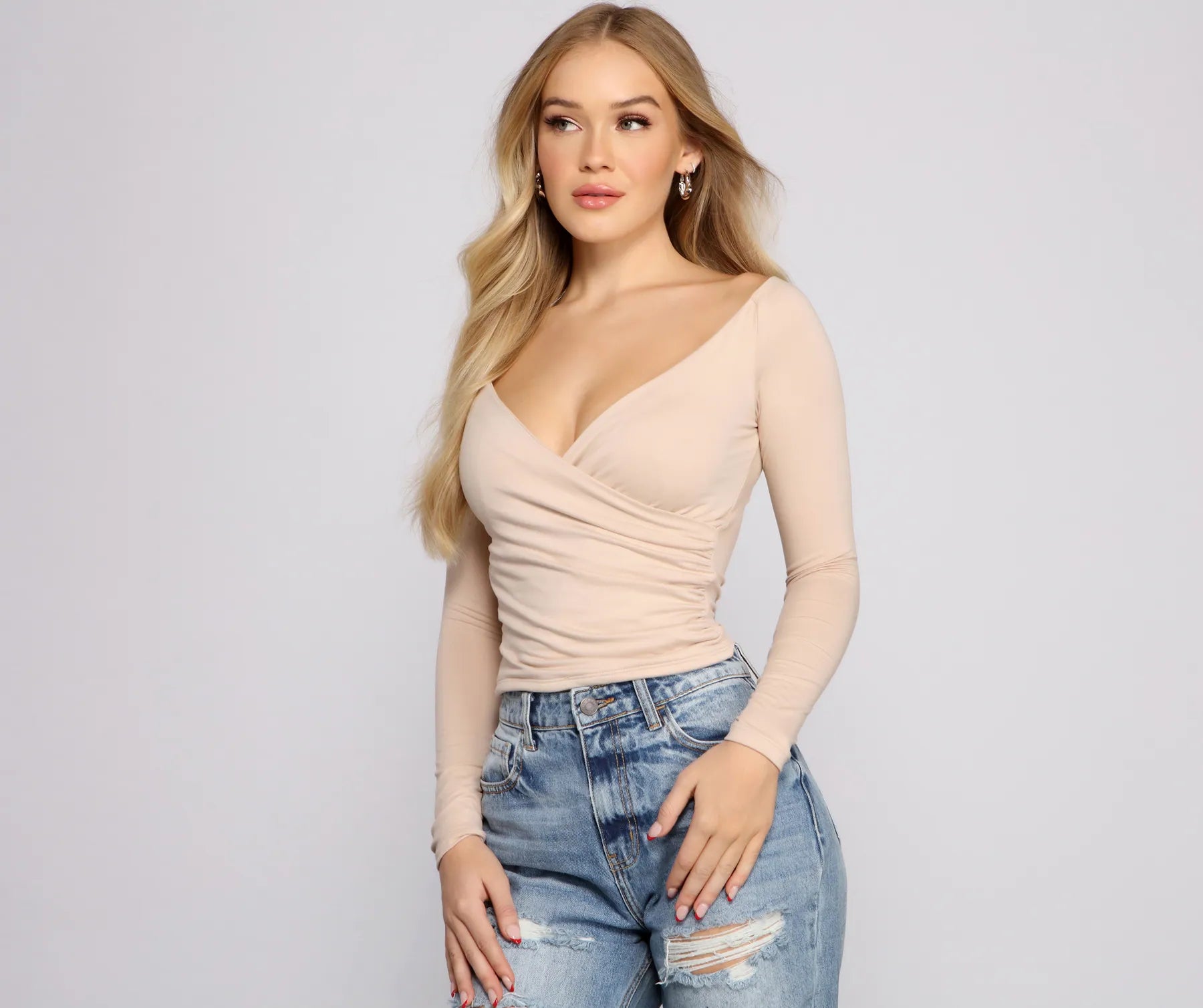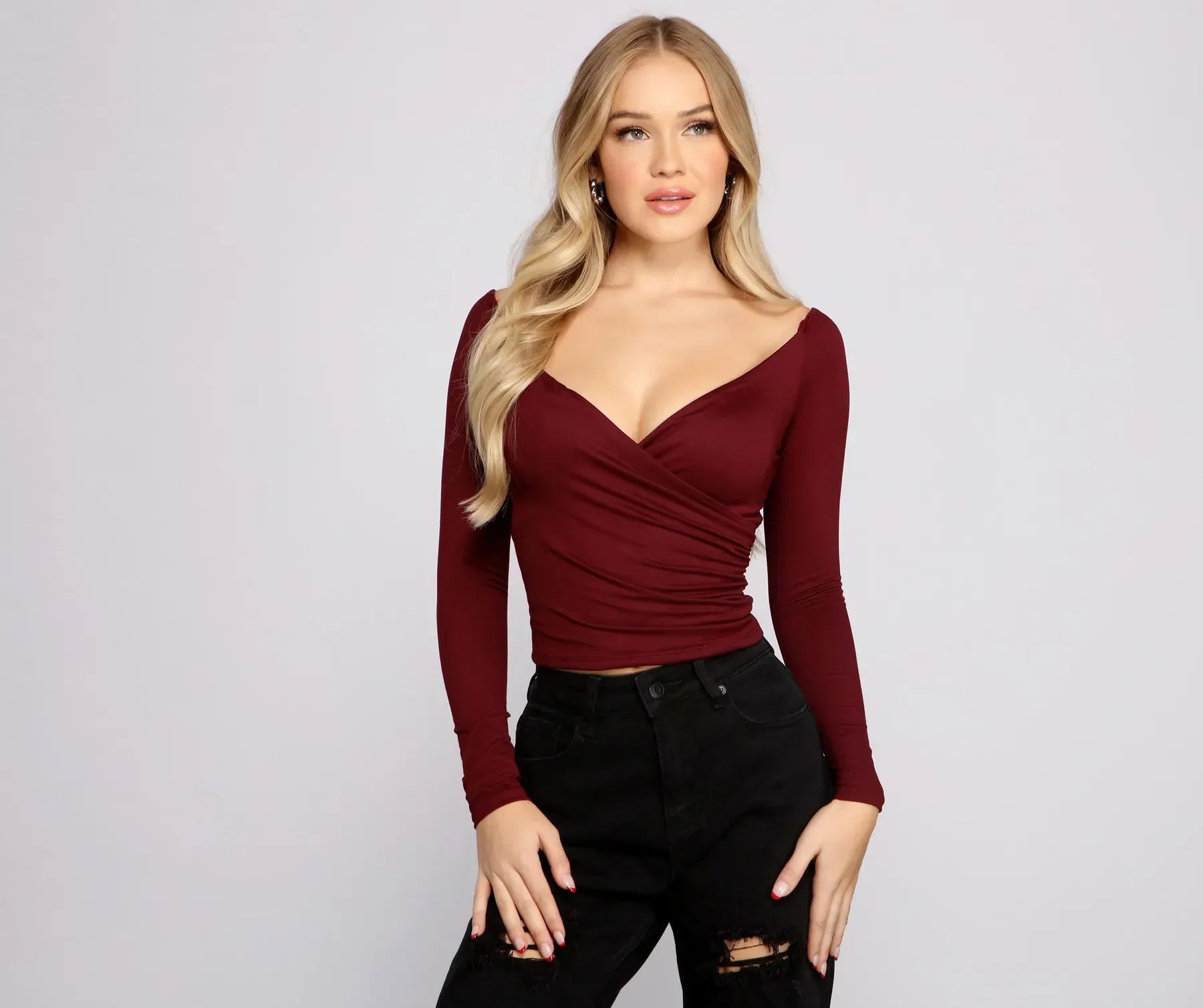 Keep it basic in a top that is so cute to go with all your favorite and . The top features a plunging wrap V-neckline. long sleeves. a ruched side seam. and a cropped hem. The top is composed of a soft to the touch cotton knit fabric that offers a relaxed fit with a moderate stretch.