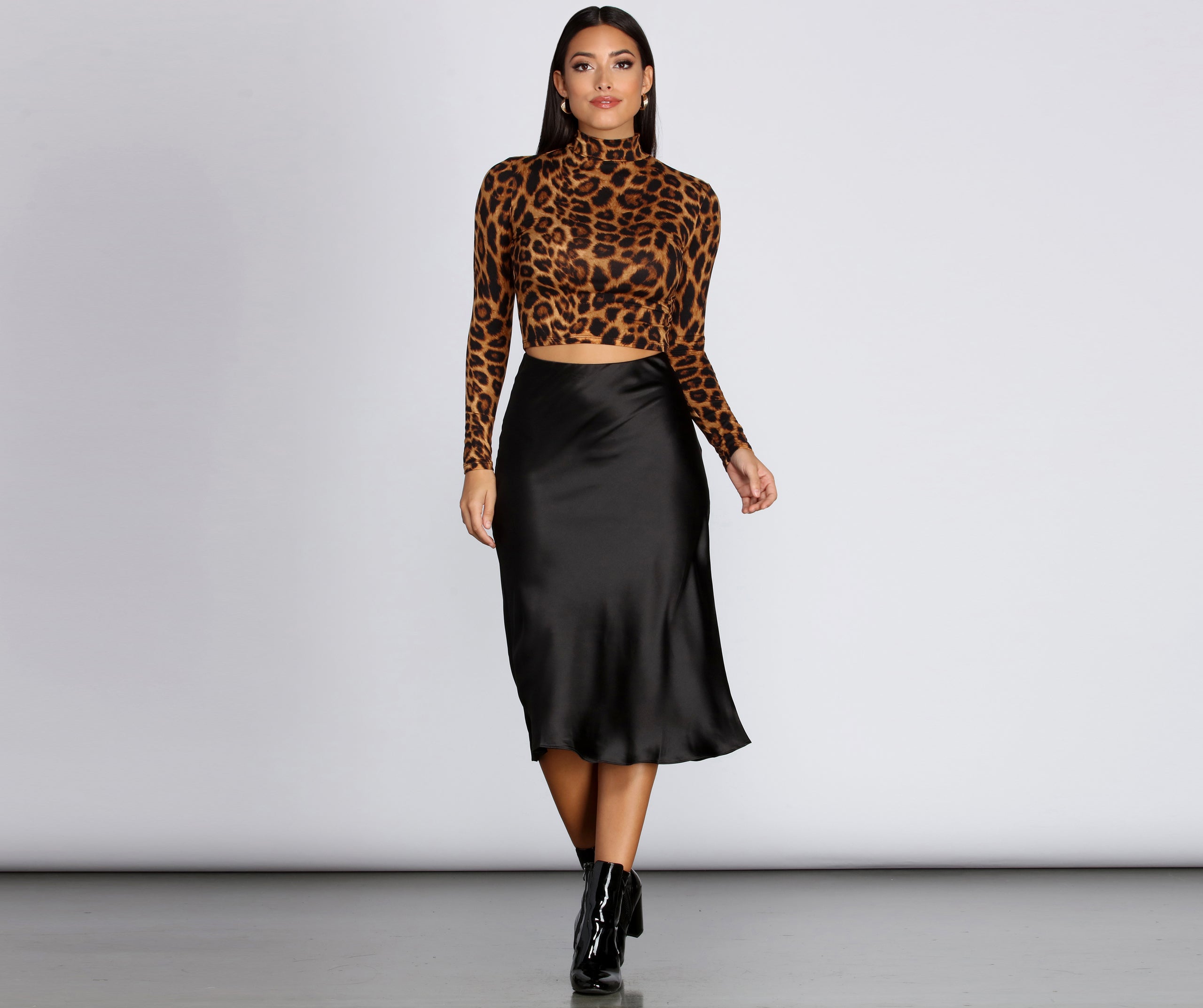 Show a little sass girl! We encourage it! This mock neck top is designed with long sleeves. a cropped hem that hits mid torso. and is composed of a cotton like material that offers moderate stretch and showcases our fave leopard print pattern. Pair with your fav satin midi skirt. or denim!