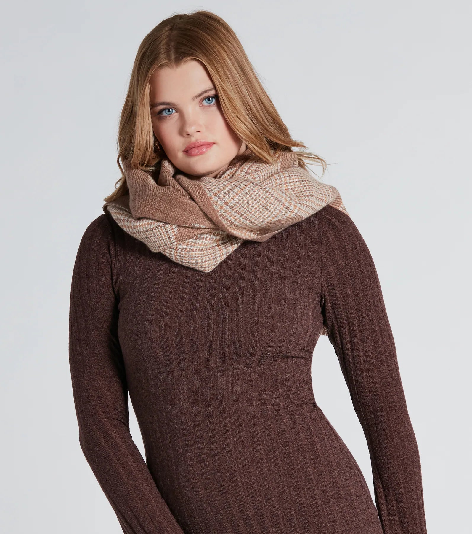 This adorable plaid heart print scarf will show off your love for the cozy season! Composed of a soft woven material with short fringe hems. this long scarf features a classic plaid print and the cutest all-over heart pattern with a two-tone design. Layer over a sweater dress with !
