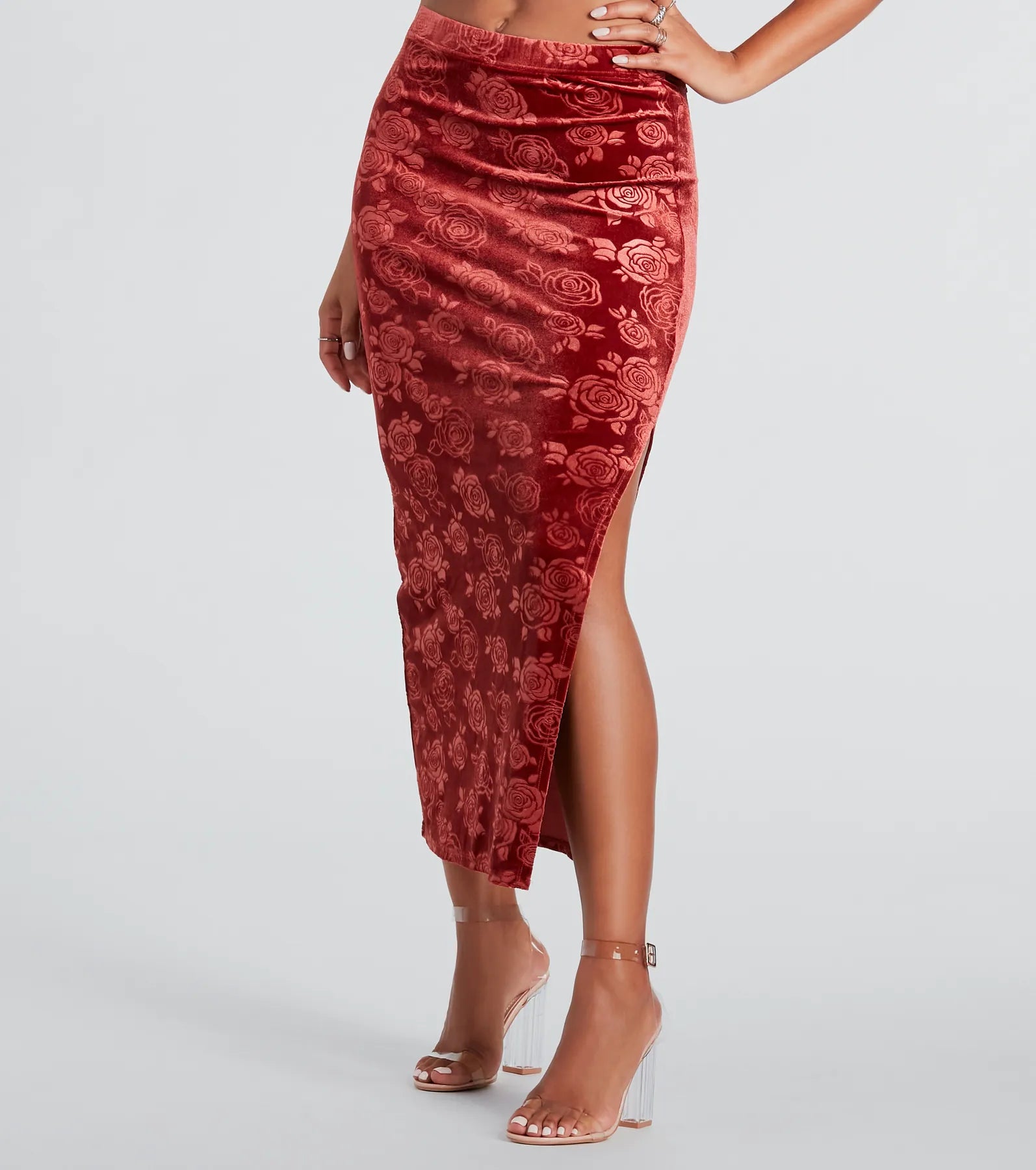 With this midi skirt. you won’t be asking yourself if they love you not! It features a high-rise waist. bodycon silhouette. and a sultry velvet floral burnout pattern with a sewn-in knit lining. Complete the look with the matching top for a date!
