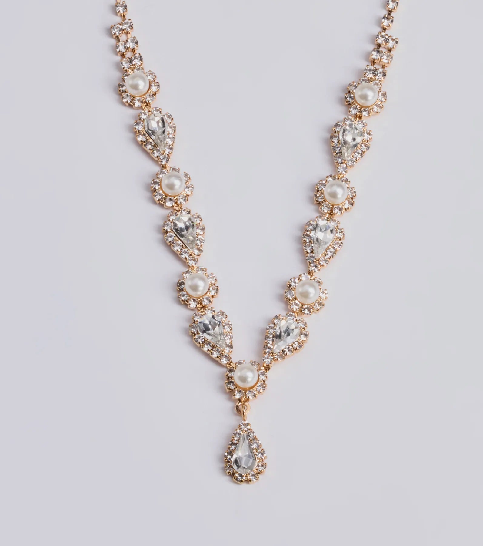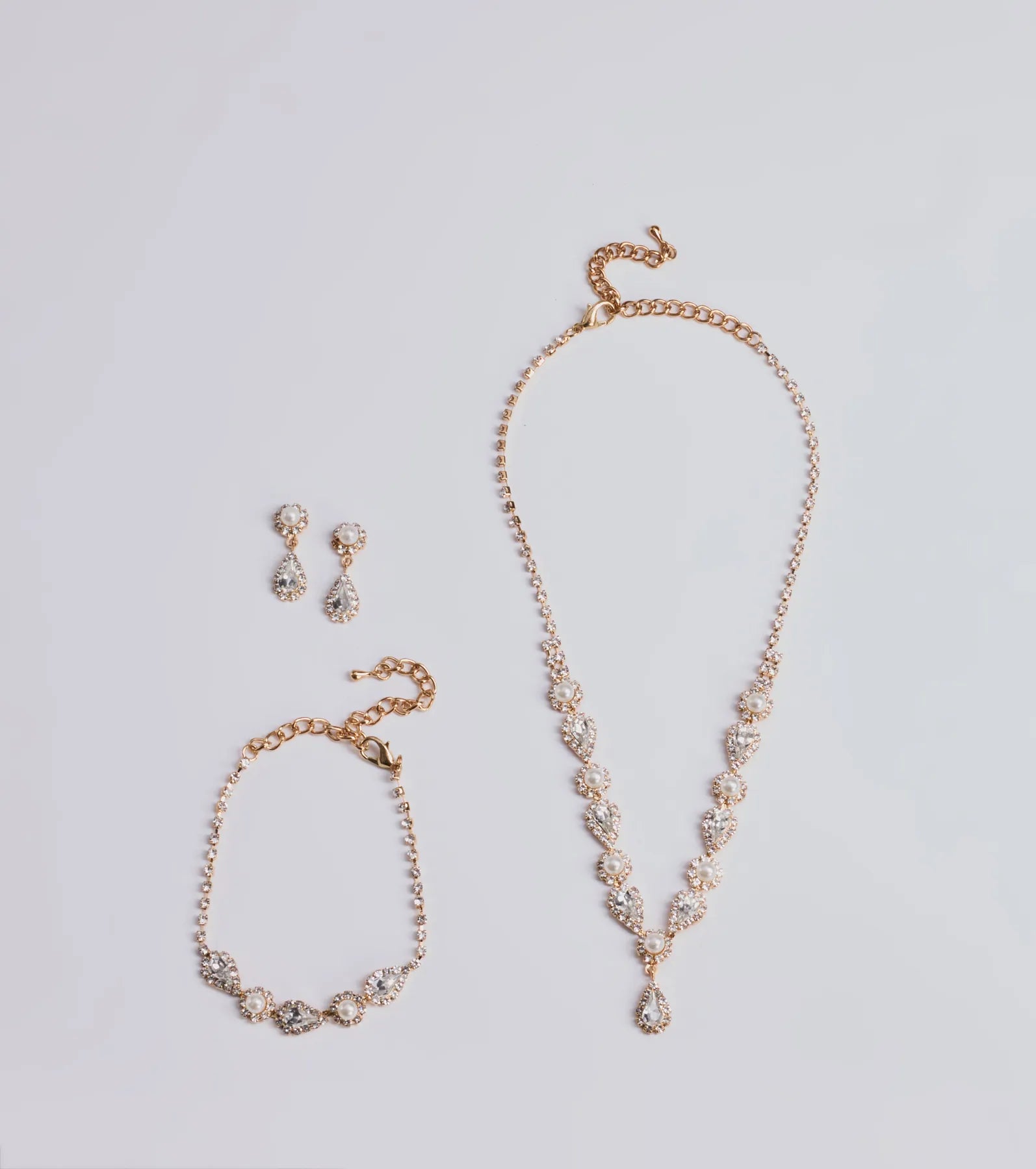 Luxe and elegance. this divine jewelry set includes matching rhinestone and faux pearl earrings. one bracelet. and a necklace. Pair with a formal floor-length dress.