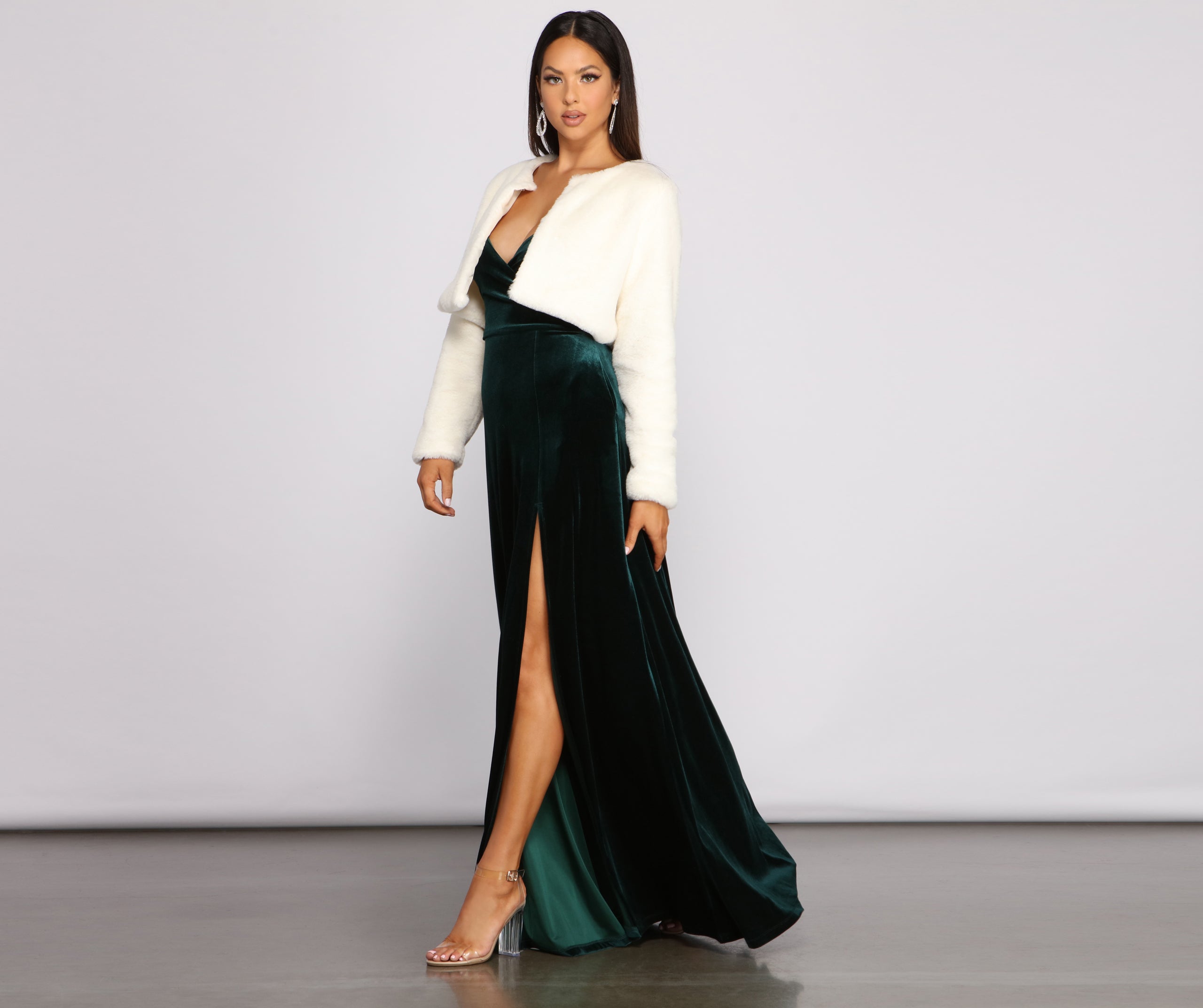 Wrap yourself with a luxe jacket to accent your fancy dresses for your next night out. The jacket features an open front with a hook and eye closure. long sleeves. and a cropped fit. The jacket is composed of a soft to the touch faux fur fabric that offers a relaxed fit with minimal stretch. Complete look with a .