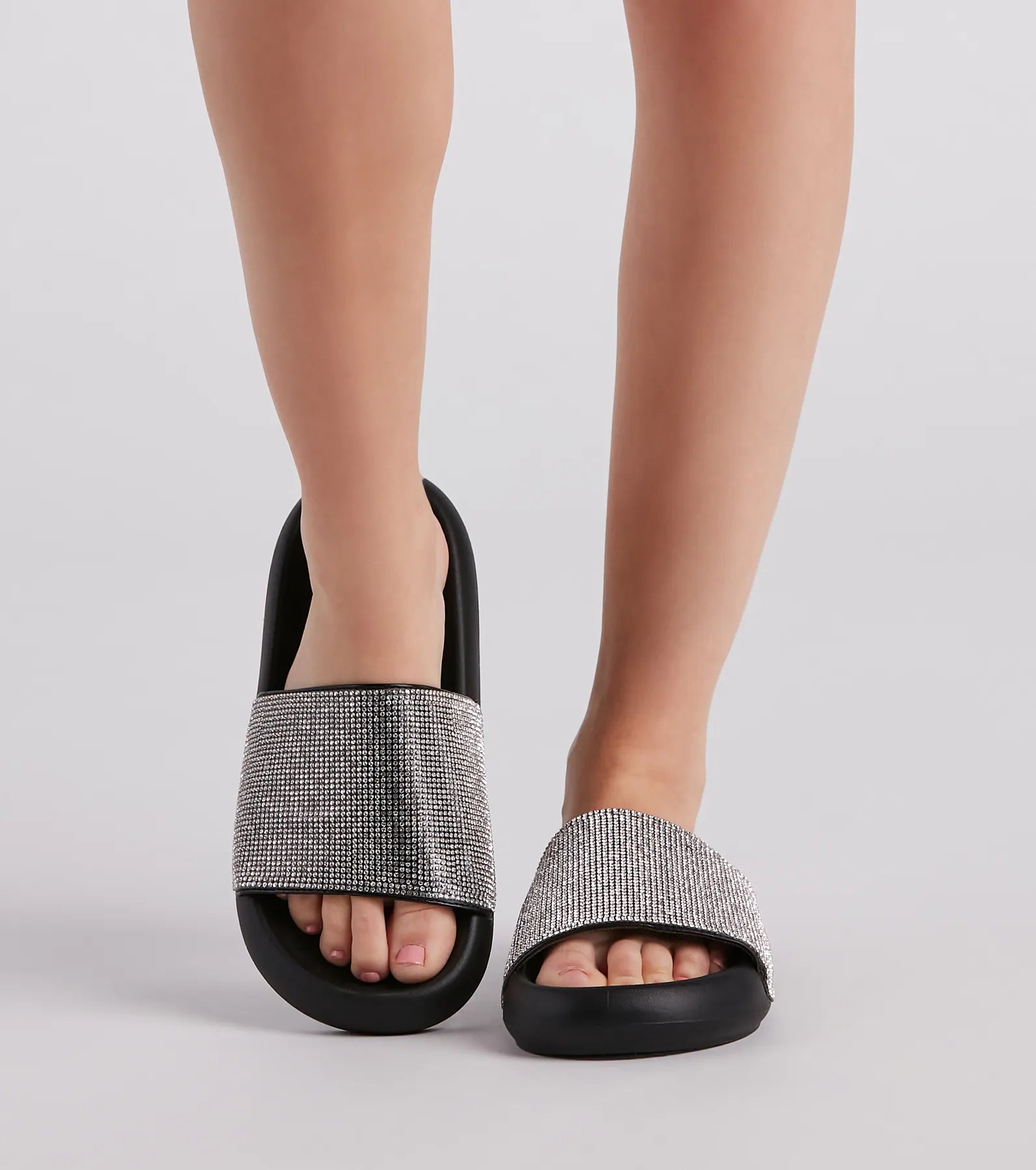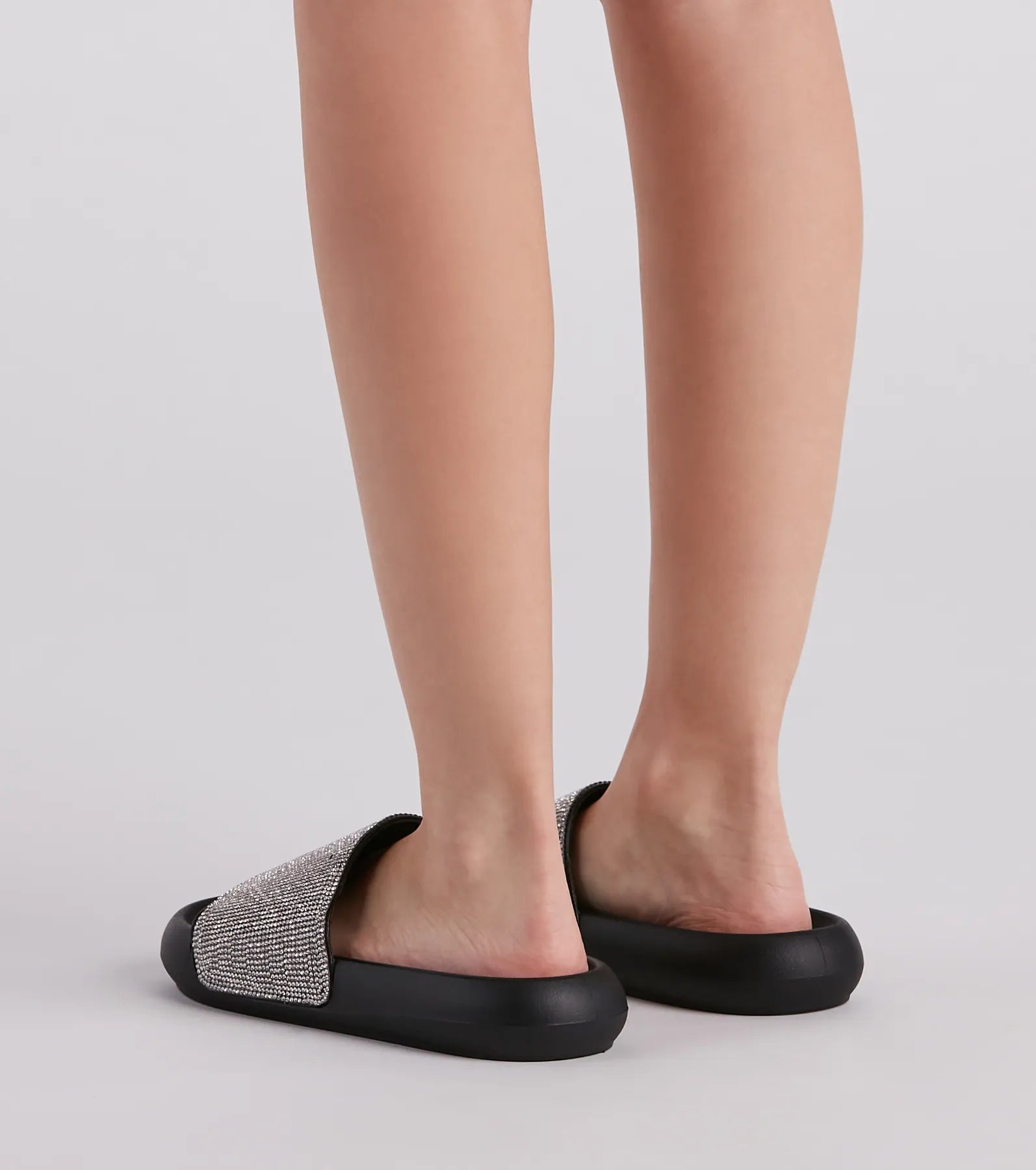 Have yourself a luxe lounge look slipping into these slides featuring a round toe. comfort foam sole. and an embellished rhinestone wide strap. Style with a cozy to complete the look!