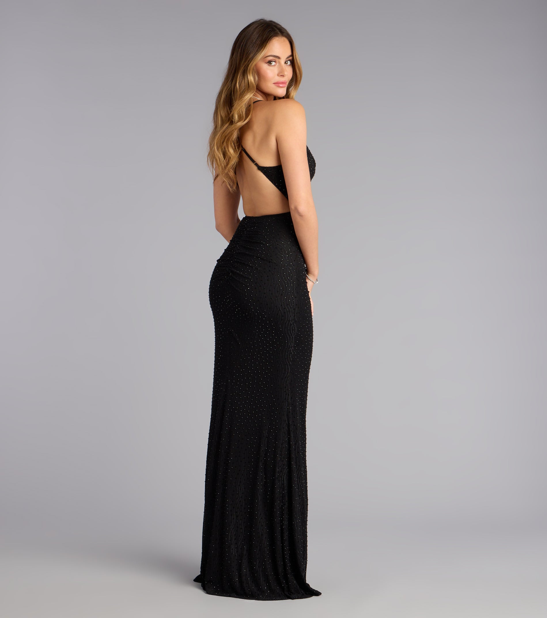 Shimmer and shine in the Lyra rhinestone mesh gown. designed with a draped cowl neckline. strappy open back. and curve-hugging mermaid silhouette. A daring high slit adds the perfect touch of drama for your most glamorous nights.
