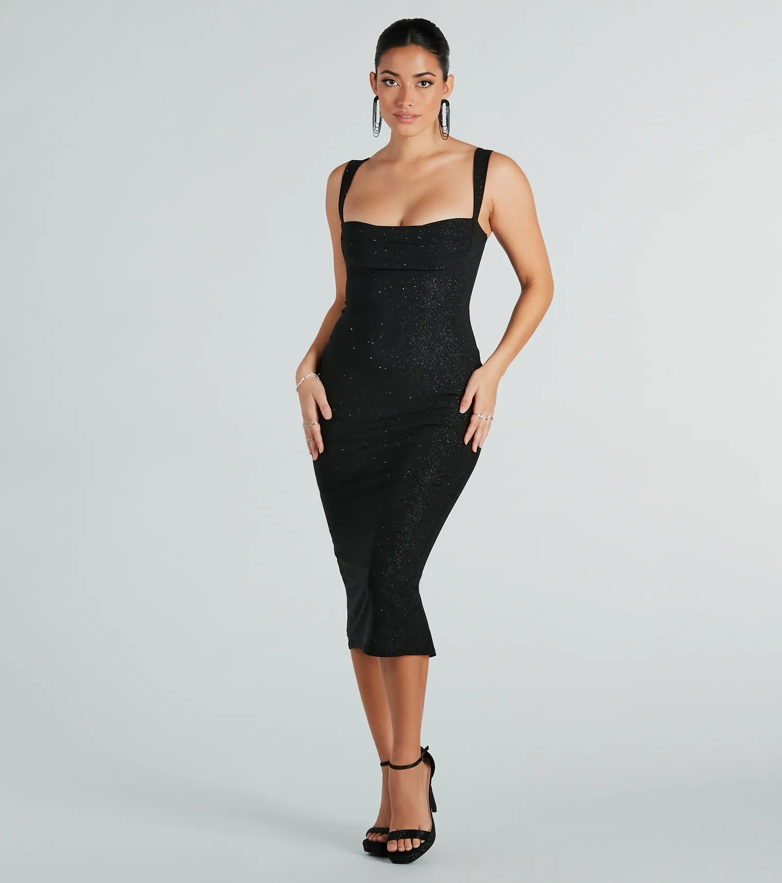 Radiate sparkle in the Marcella formal glitter midi dress that emulates shine! She features a cowl neckline. tank shoulder straps. and a form-hugging silhouette. The midi-length hem and back center slit complete the sophisticated silhouette with an elegant touch. The formal midi dress is crafted from a glitter fabric that shimmers with every step and has a stretchy knit lining. Complete the look in for a banquet or holiday dinner!