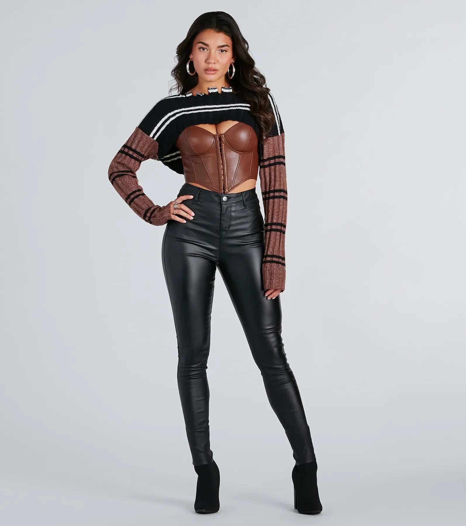 Who says you can’t have it all? Achieve an elevated fashion fit’ with this striped sweater topper featuring contrast striped loose long sleeves for a look that is both cozy and chic. a distressed crew neckline. and a contrast striped design on soft rib knit fabric. Style over a sleek for an edgy look for a dinner and movie!
