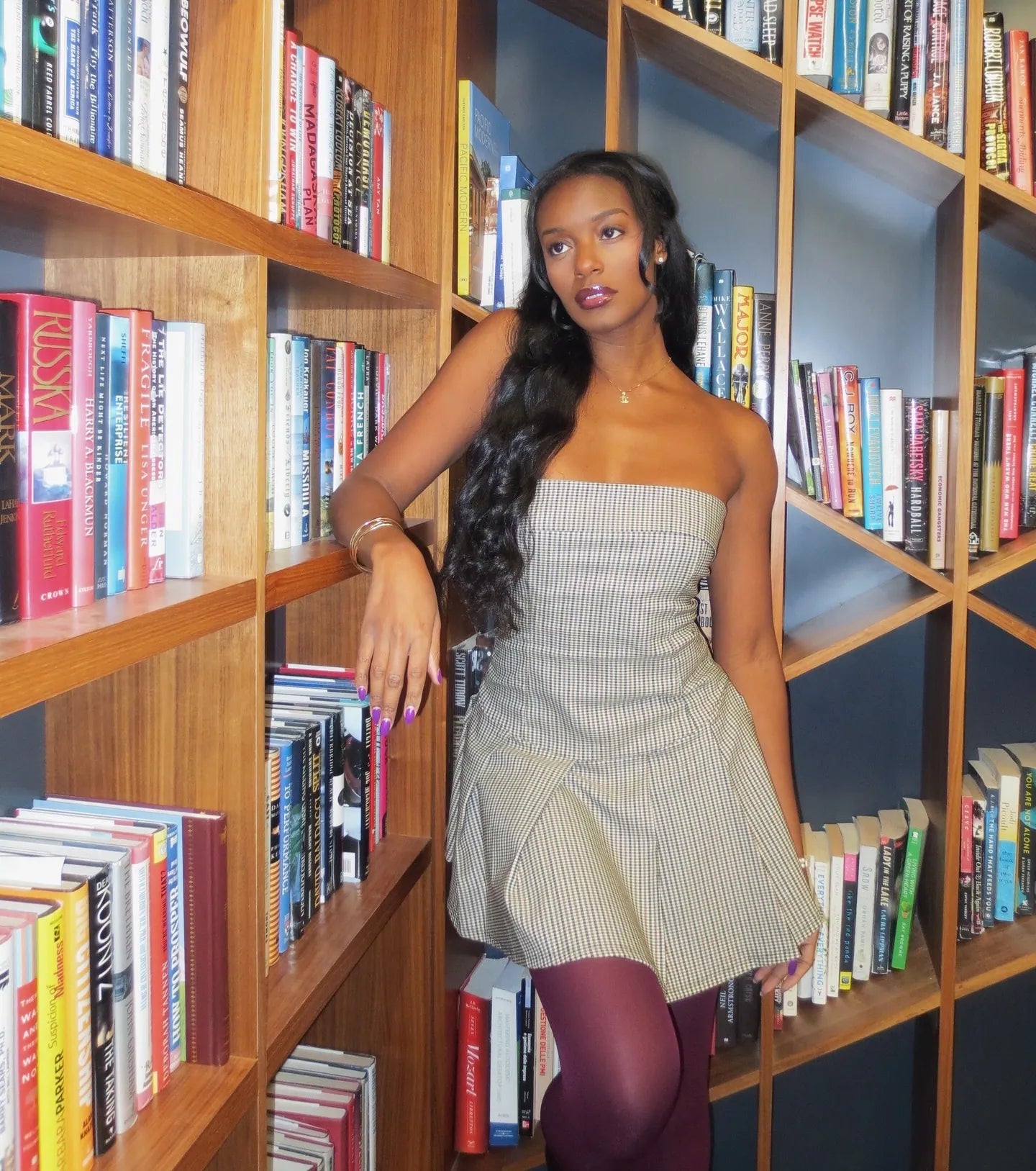 A strapless plaid mini dress features a form-hugging fit with a sassy pleated hem. Perfect for back-to-school styling.