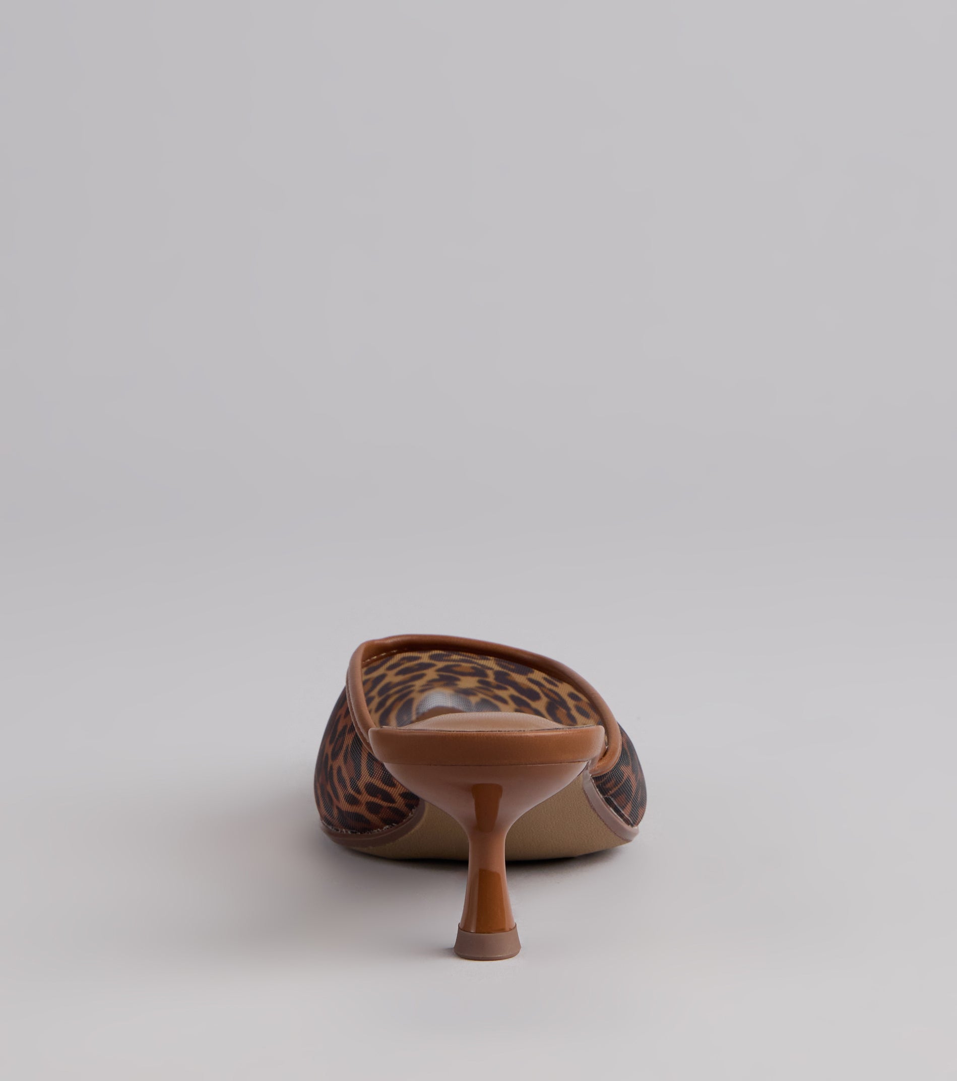 Step out boldly in these mesh leopard pumps showcasing a closed-toe design and sleek kitten heel that dresses up your day or night look.