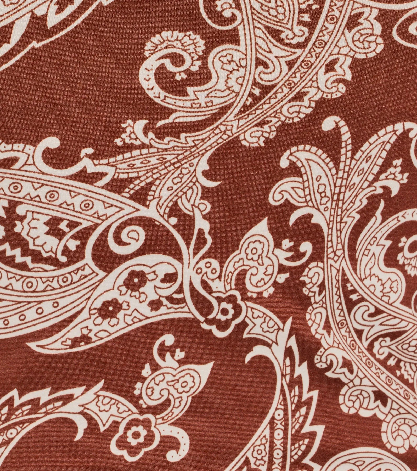 A strapless crop top features a sweetheart neckline and a center front drawstring tie with a flirty slit accent. The knit fabric showcases a retro paisley print perfect for pairing with shorts.