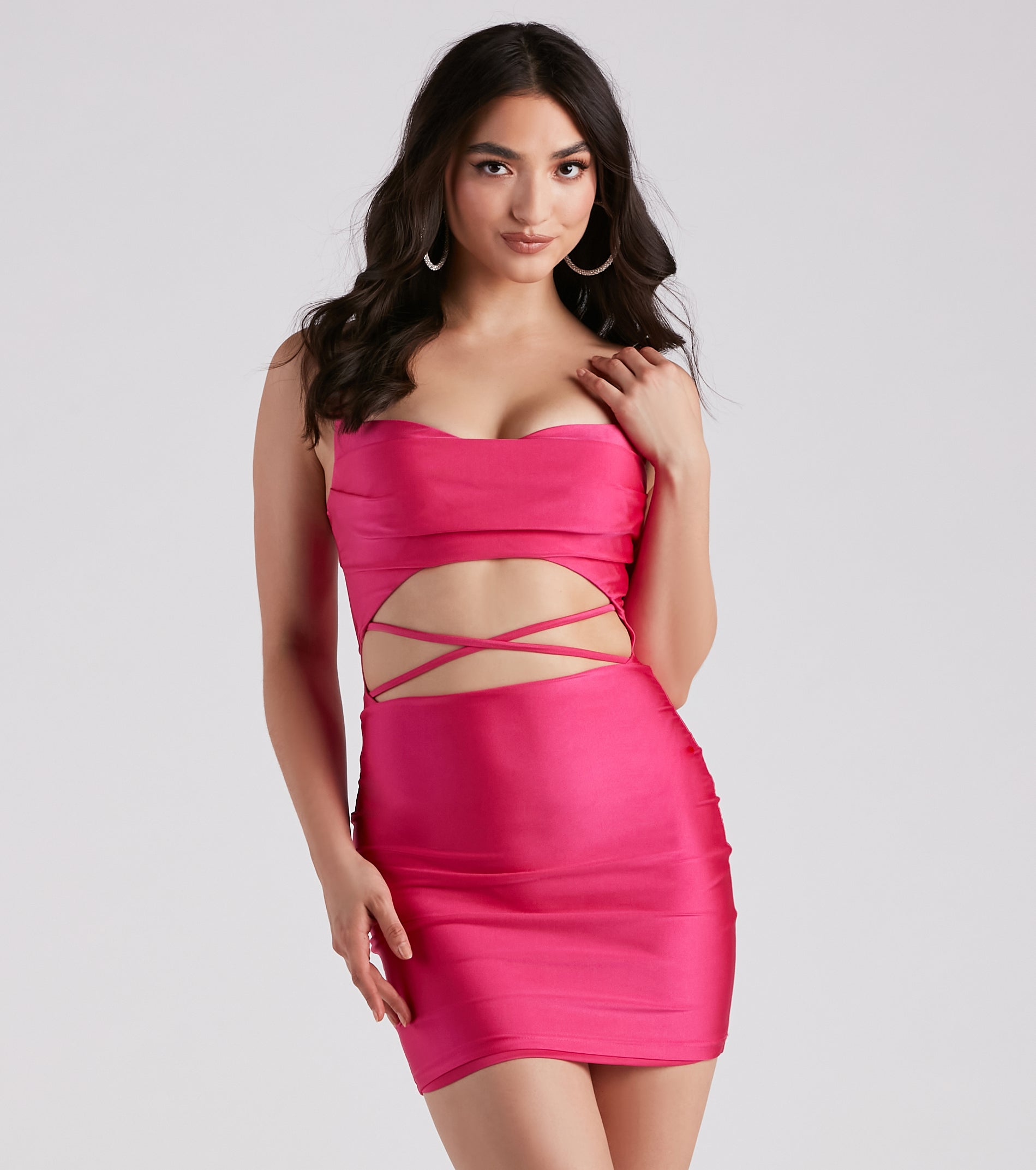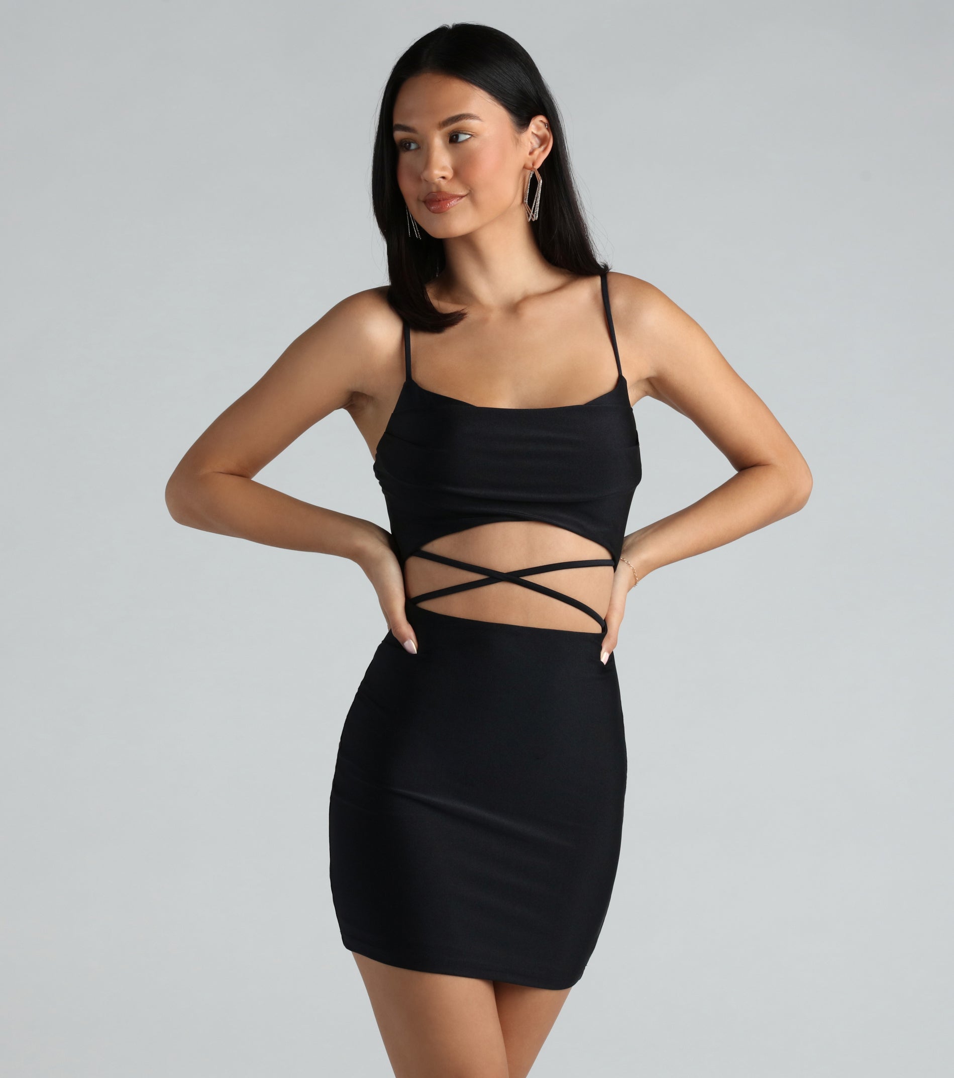 This mini dress is ready to party all over town! The short dress features a sleeveless V-neckline with a cowl draping. adjustable spaghetti straps. a cutout waist with criss-cross straps. and a bodycon silhouette on stretchy lined knit fabric. Style this mini party dress with a sparkly and heels!