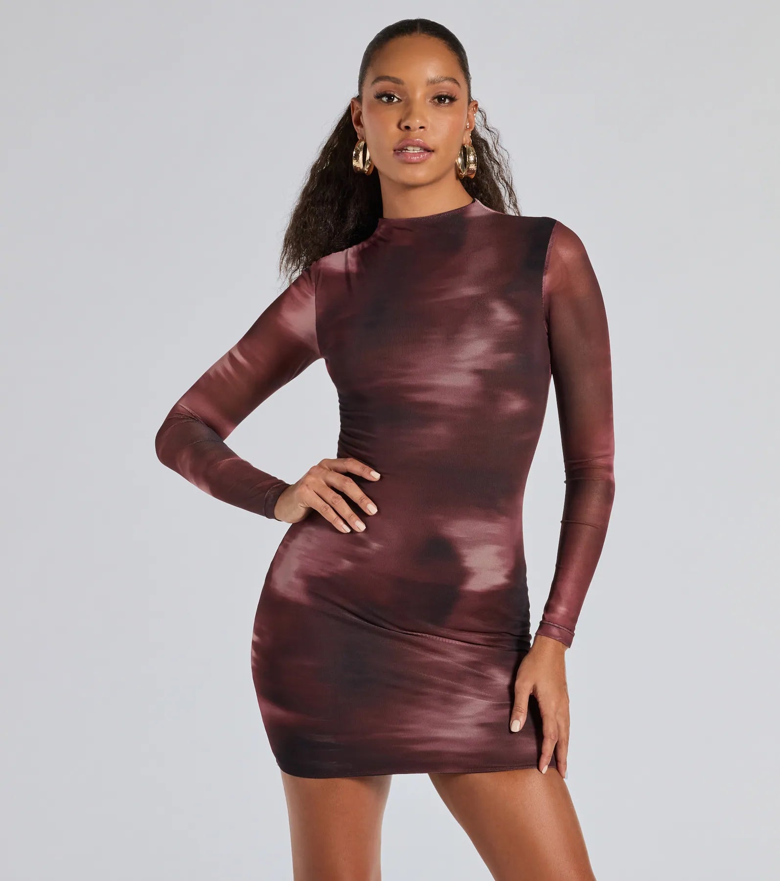 An abstract print mini dress features sheer fitted long sleeves. a mock neckline. and a flattering bodycon fit. Perfect for styling with stiletto heels.
