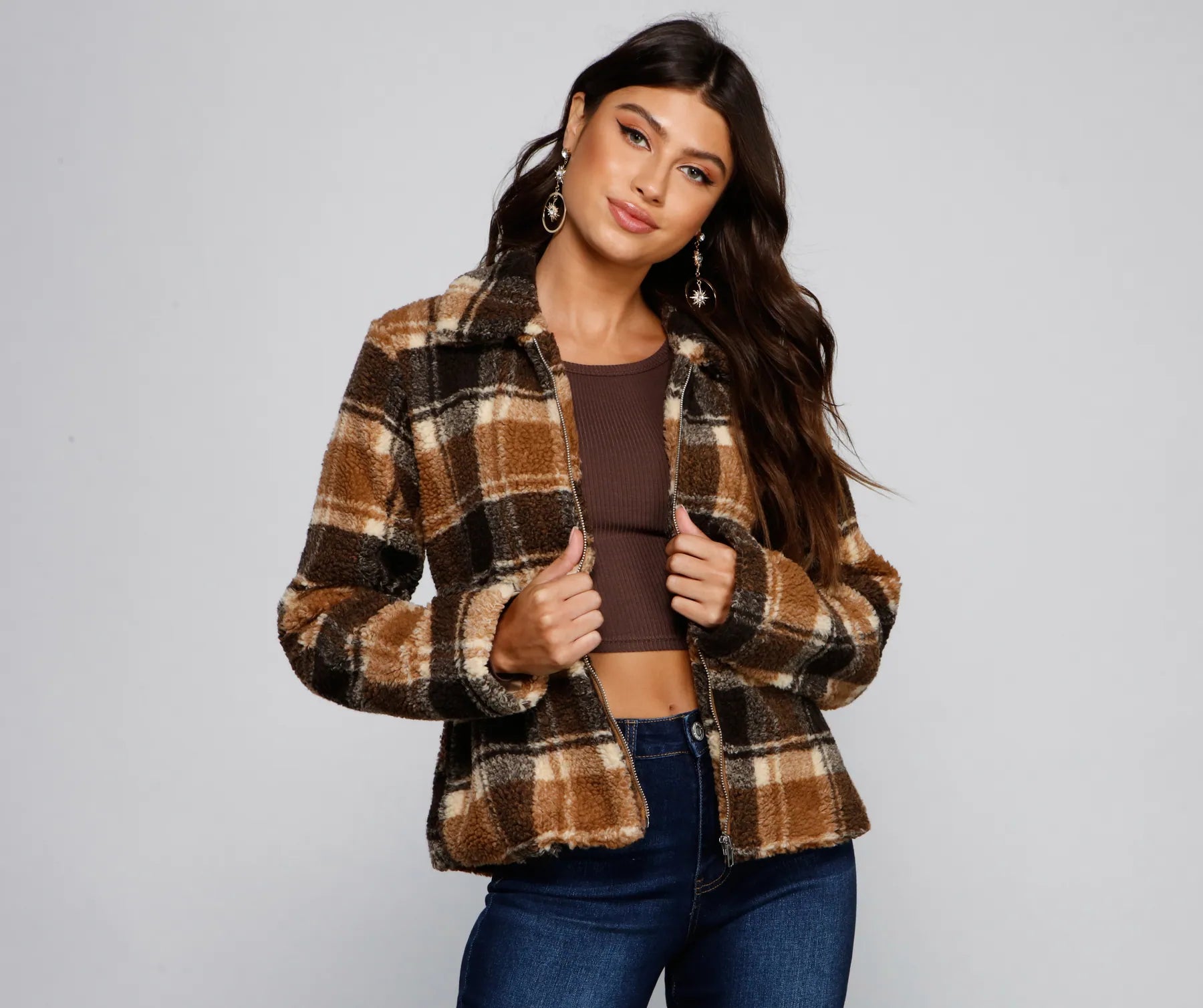 Keep it pretty in a plaid jacket to layer up with! The jacket features a collared neckline. a zipper front closure. a plaid print. long sleeves. and composed of a wubby fabric. Complete your look with a and .