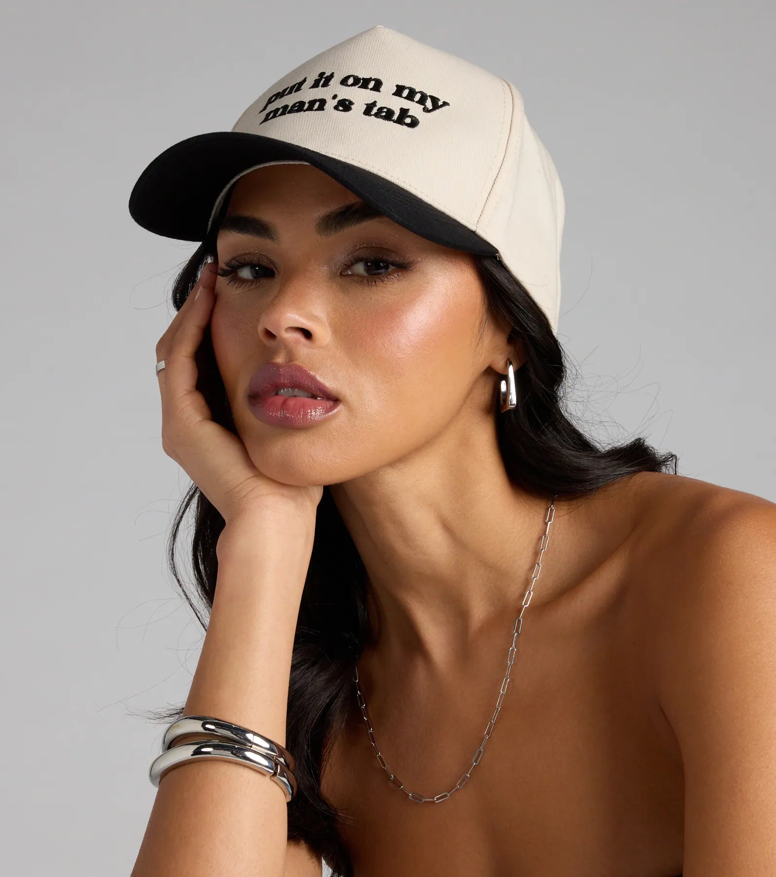 Drink up. cause bae is buying! Flaunt this sassy snapback cap featuring a front script that reads Put It On My Man’s Tab and a curved. wide brim for some shade.