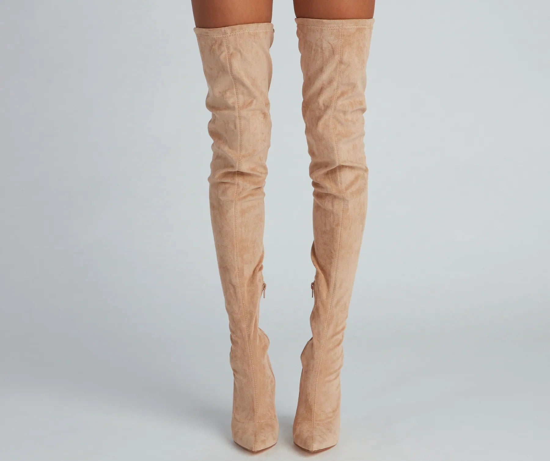 Raise the bar with boots that keep your look on point! The boots feature an over-the-knee fit. a lace-back accent. an inner zipper closure. a pointed toe. and a stiletto heel. The boots are composed of a faux suede material. Complete look with a ribbed mini dress and .