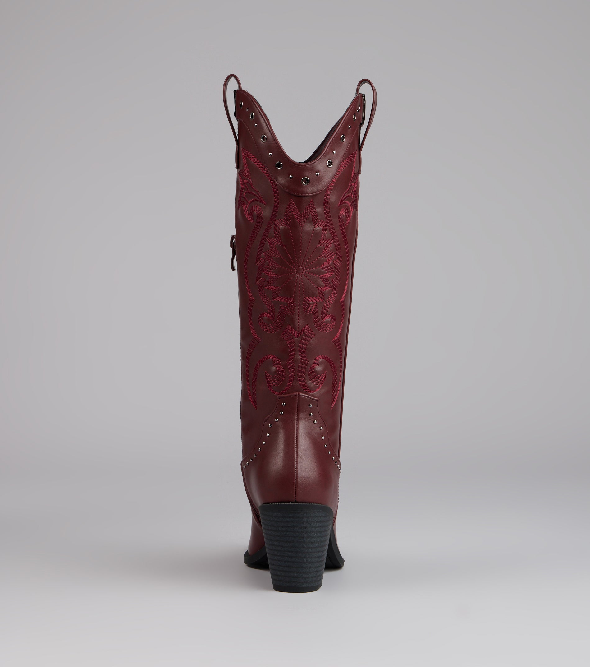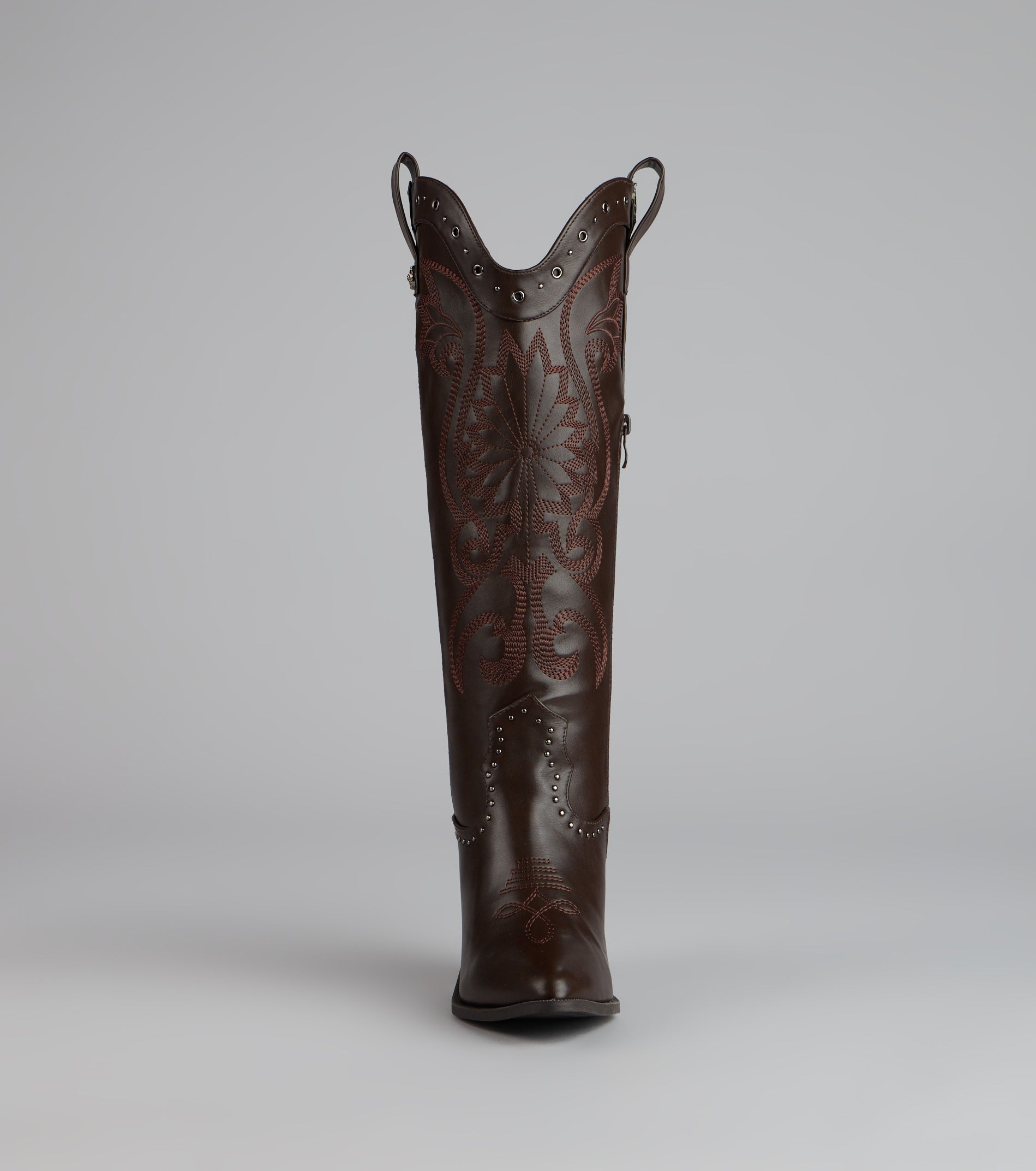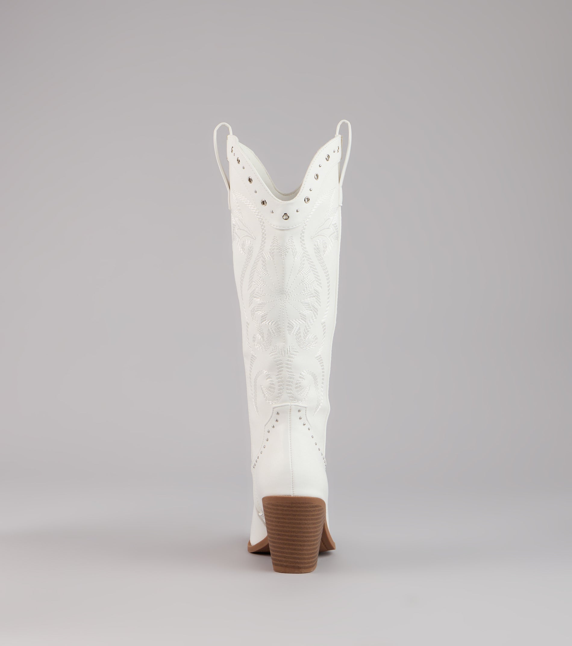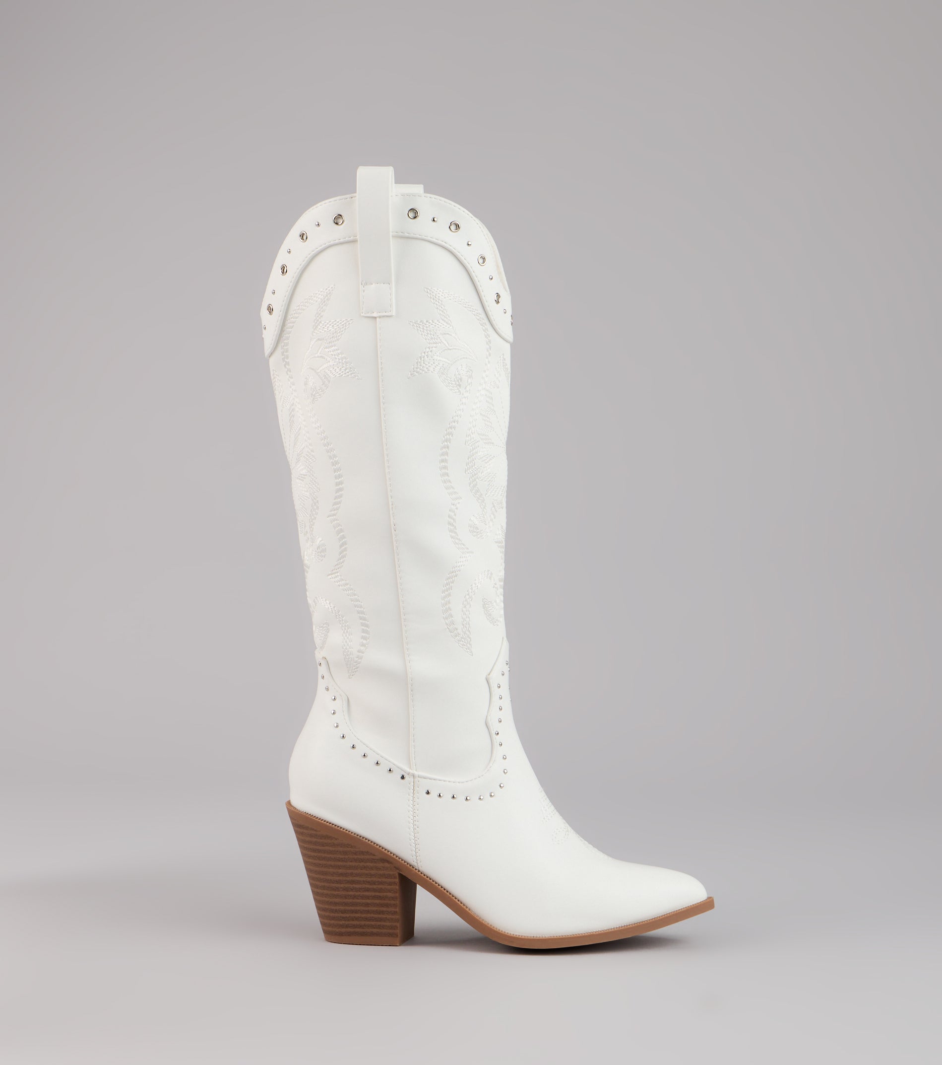 Western. but make it glam. These faux leather cowboy boots mix classic embroidery with studded detailing and a sleek pointed toe—perfect for bachelorettes. country concerts. or costume parties.