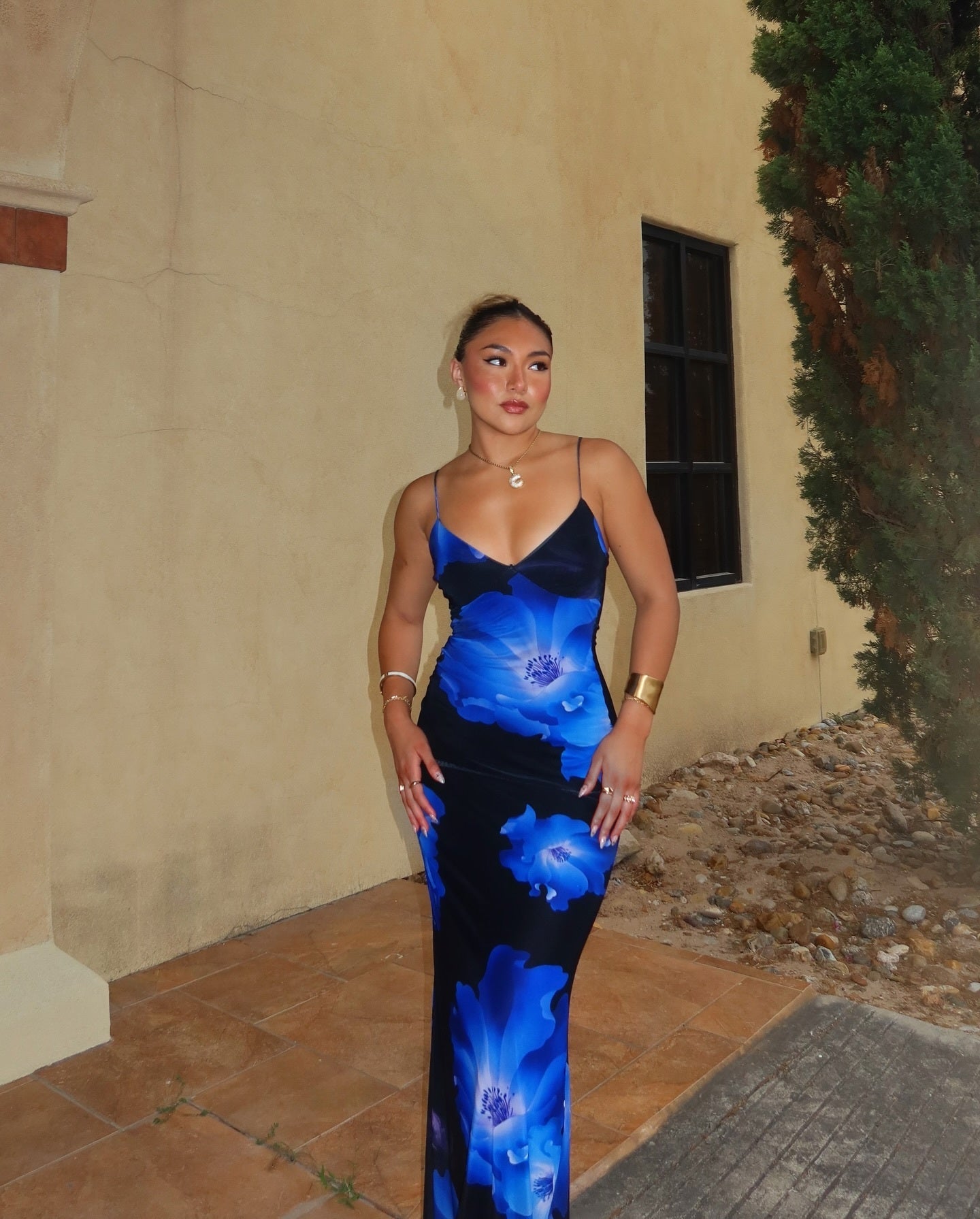 Make a stunning entrance in this large blossom floral maxi dress at dinner while on vacation or the weekend! Showcasing a statement blossoming floral print. this maxi dress is designed to turn heads. With a flattering V-neckline and delicate spaghetti straps. this dress hugs your curves in a bodycon silhouette and is finished with a maxi-length hem. Complete the look in and earrings!