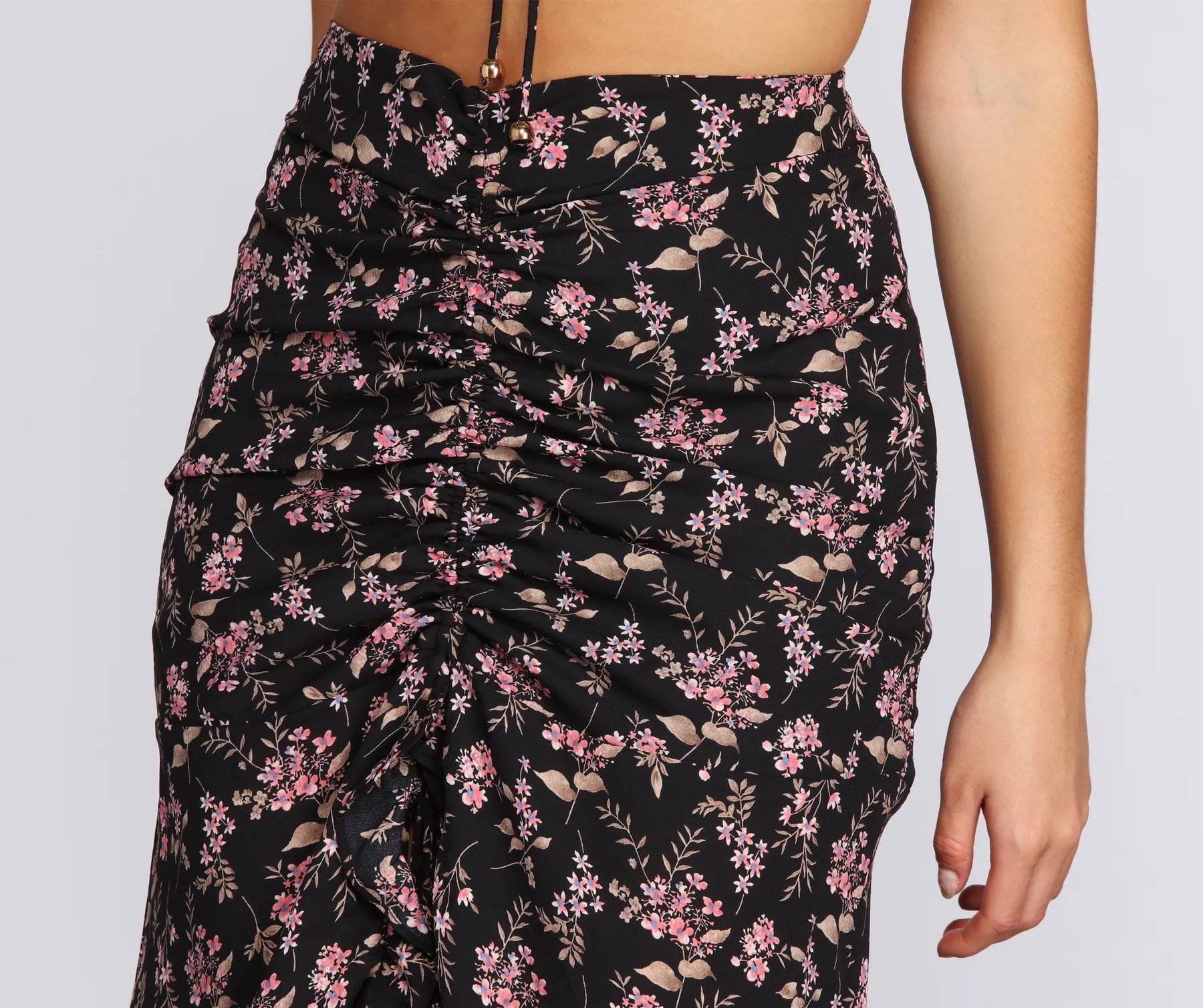 Featuring a delicate floral set against a black background. this maxi immediately draws the eye! Skirt features a back zip with hook-and-eye closure. a ruched front anchored by an adjustable bead-detailed tie. and a front slit and hem with ruffle trim. Skirt is made from a chiffon-like cotton blend with minimal stretch. Don’t forget to pair it with the matching crop top!