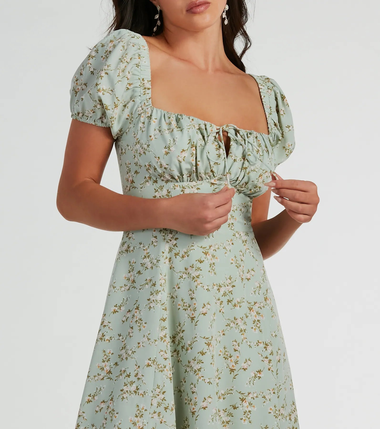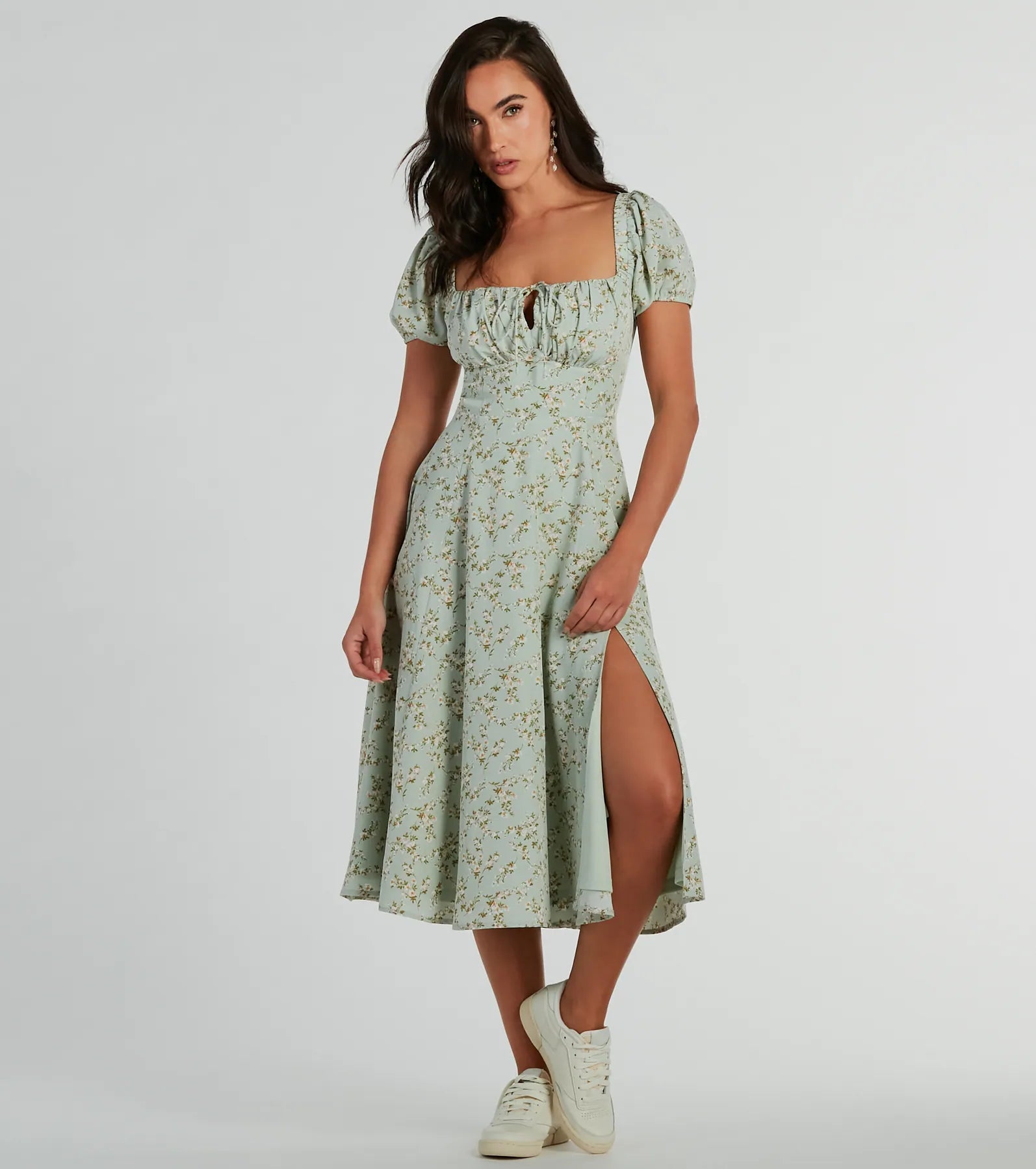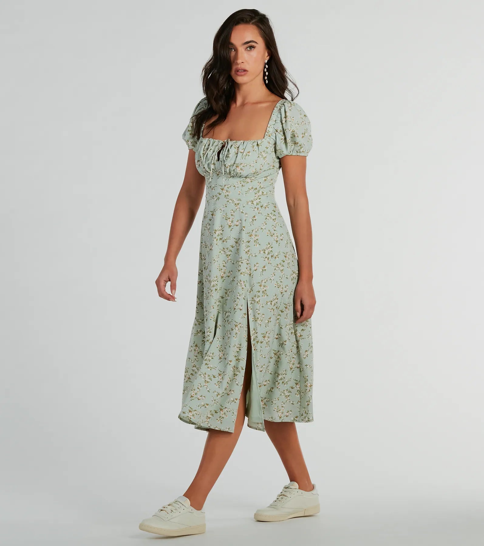 RSVP yes to shower or birthday invites when you have this cute ditsy wildflower tie A-line midi dress in your closet! Embellished with a ditsy wildflower print. this midi-length dress is sure to turn heads. With short puff sleeves and a square neckline. this dress is perfect for casual-dressy occasions. The tie front bust adds a touch of whimsy while the a-line silhouette and front slit provide movement and a flattering look. Complete the look with luxe and tennis shoes.
