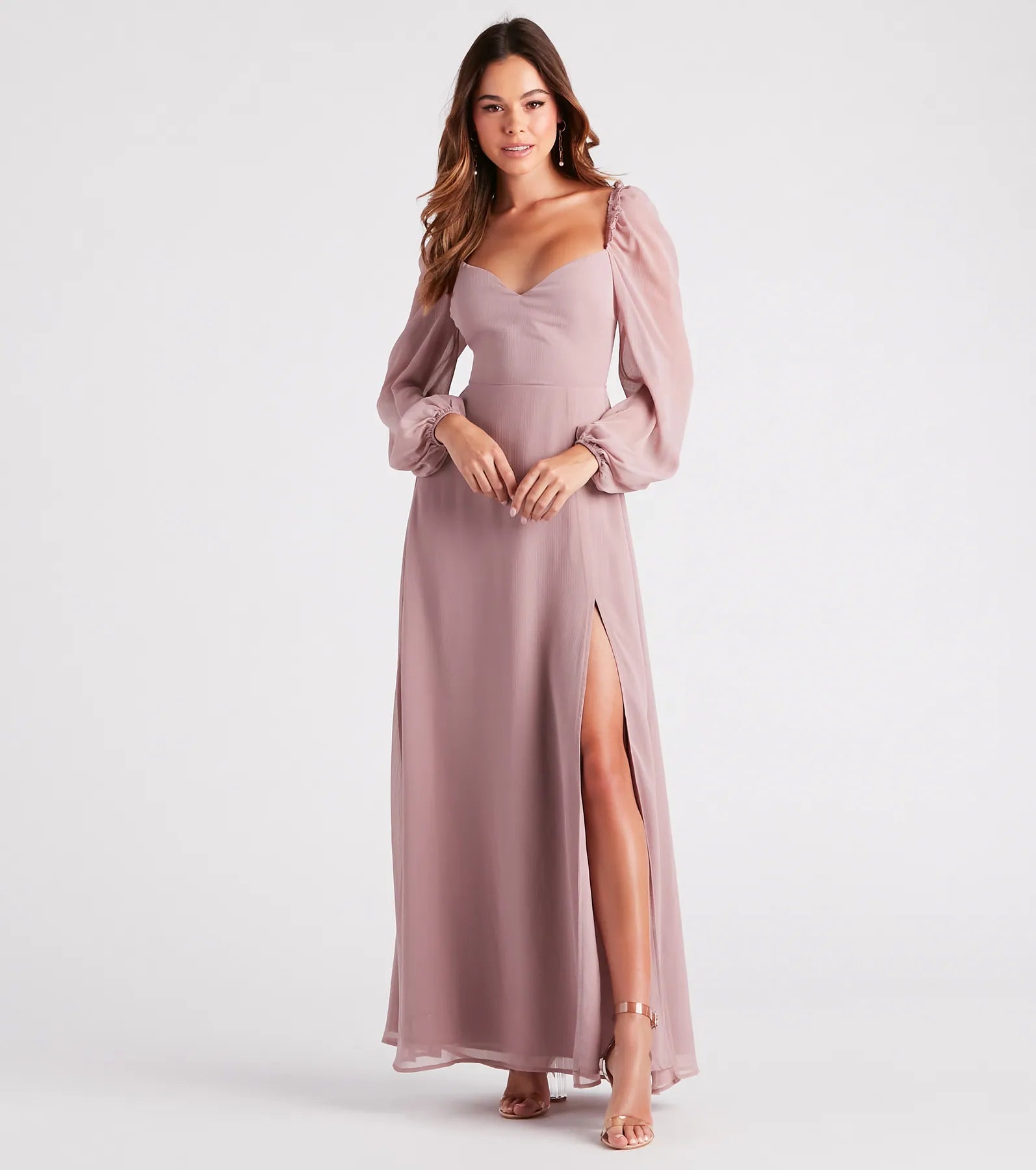 Everyone will marvel at you looking like beauty in this chiffon maxi dress perfect for wedding showers or dressy dates! It features sheer peasant long sleeves. a sweetheart neckline with a padded bust. a smocked back. and a flowy long hem with a front slit. The dress is composed of airy chiffon fabric with a smooth woven lining. Complete the look in chic .
