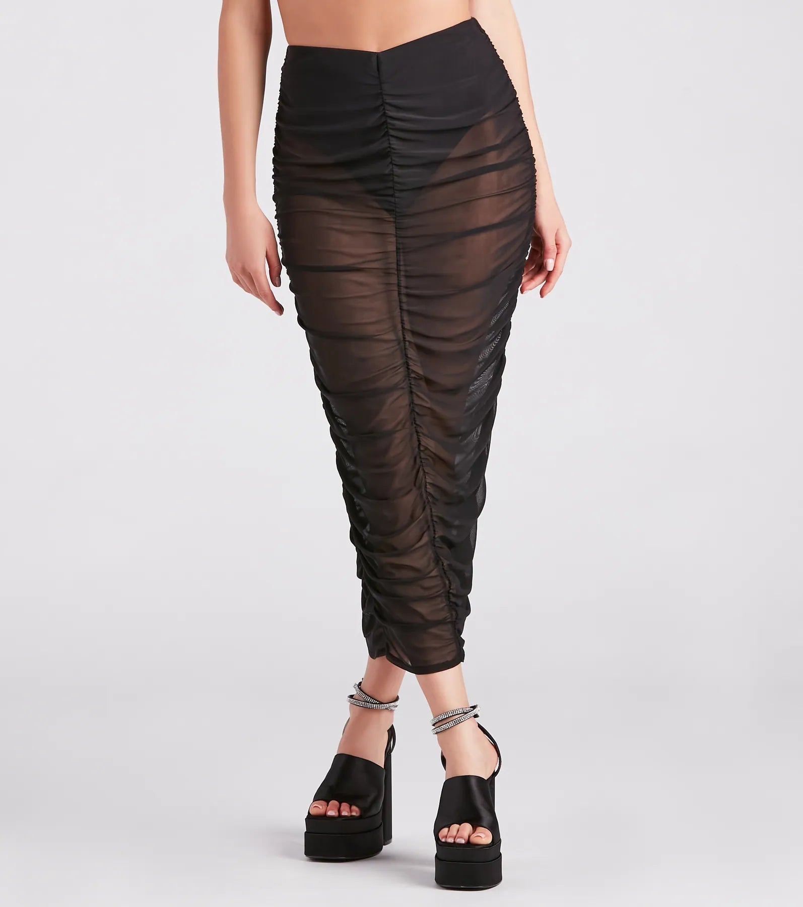 Sheer and sexy. slip into this mesh midi skirt for your next night on the town! It features an elasticized high-rise waist with attached cheeky panties. and all-over ruched seams to accentuate your curves along the bodycon silhouette. Complete the look in