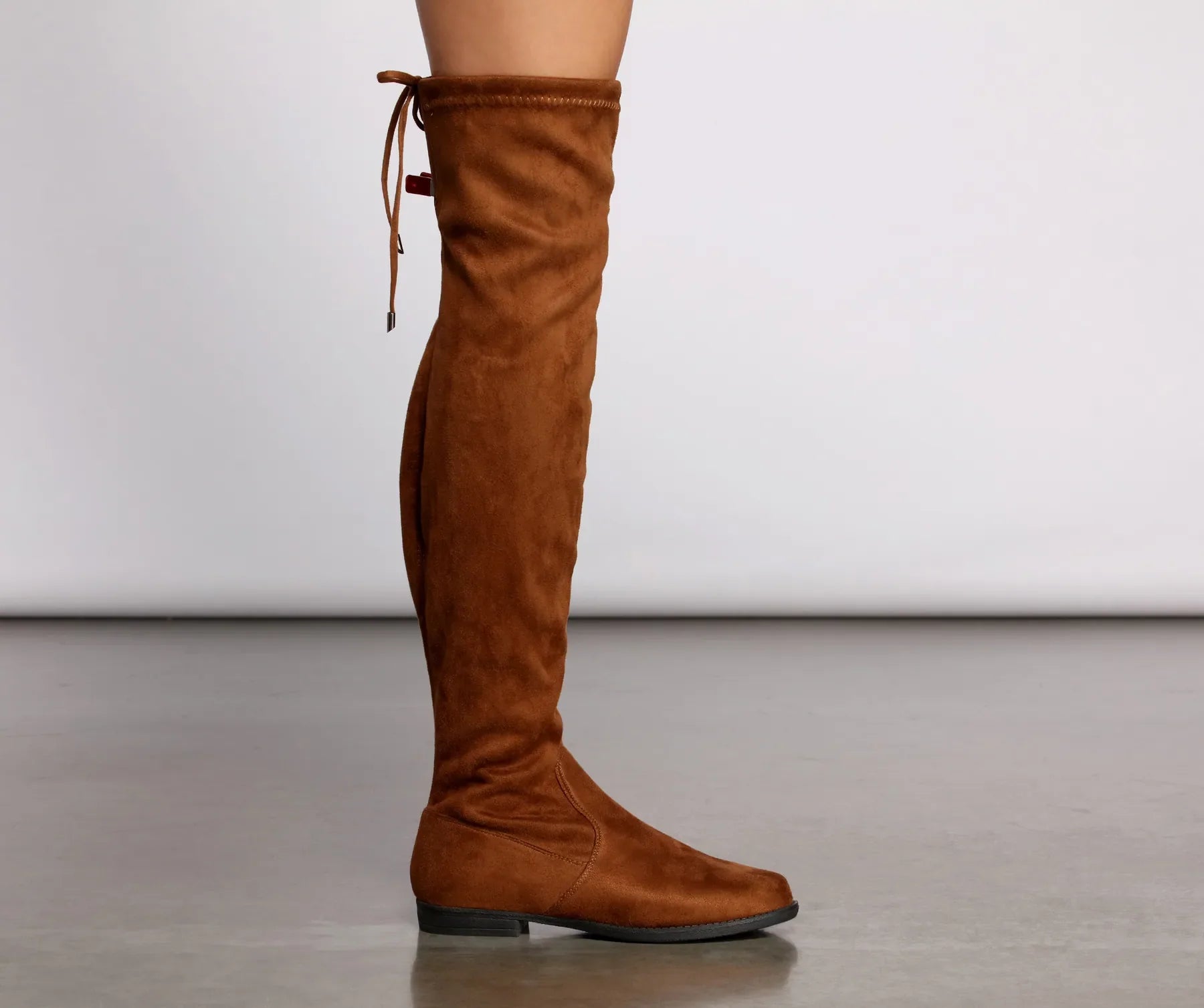 Get a simple yet very stylish look in these flat over the knee boots! They feature an over the knee design with a trendy tie back detail and smooth faux suede material. Pair these fall-ready boots with a for a cute date night look.
