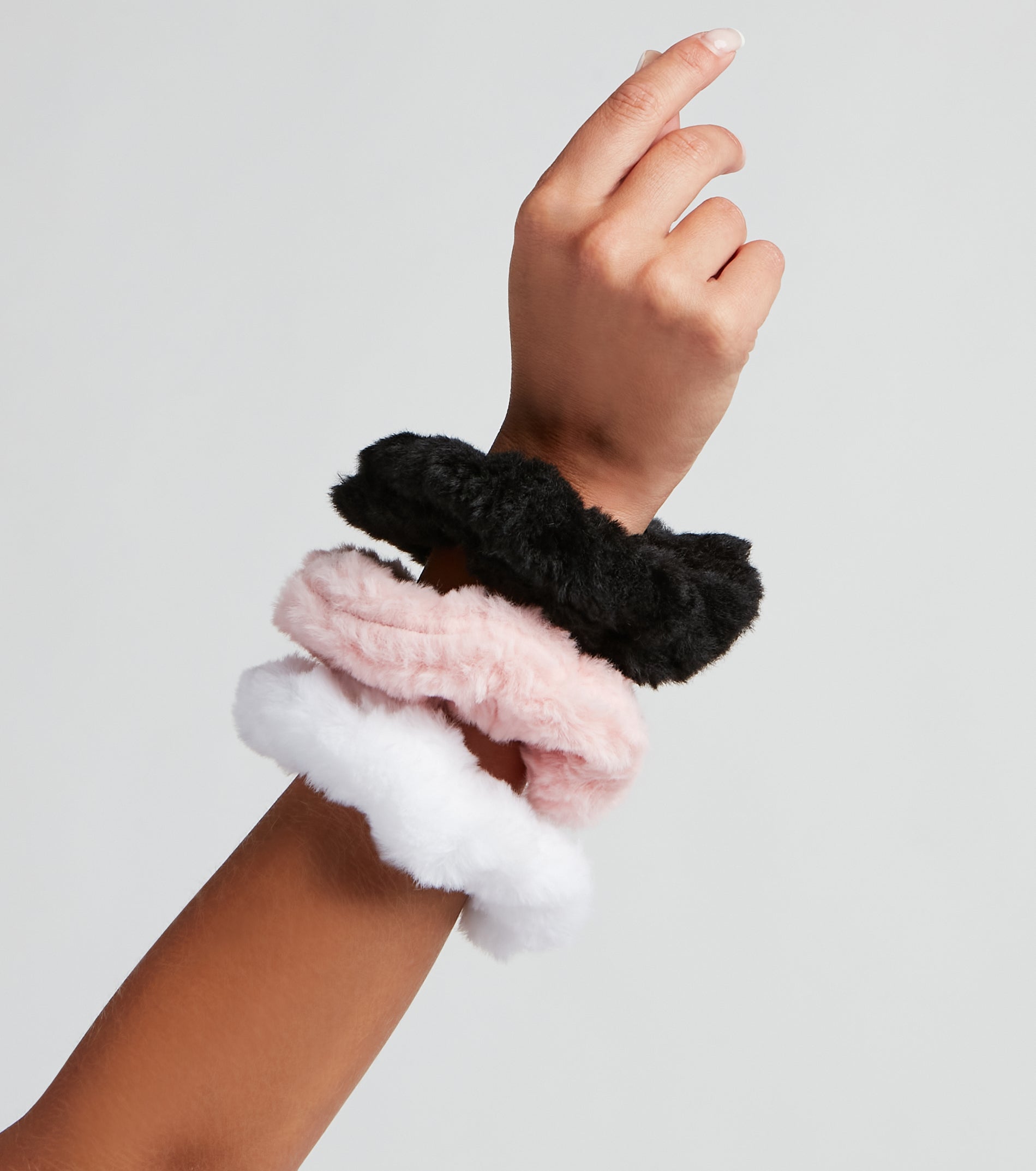 Create a cute updo hairstyle using this faux fur scrunchie set featuring a set of six in multiple colorways. Complete your everyday look with a button-down and skirt.
