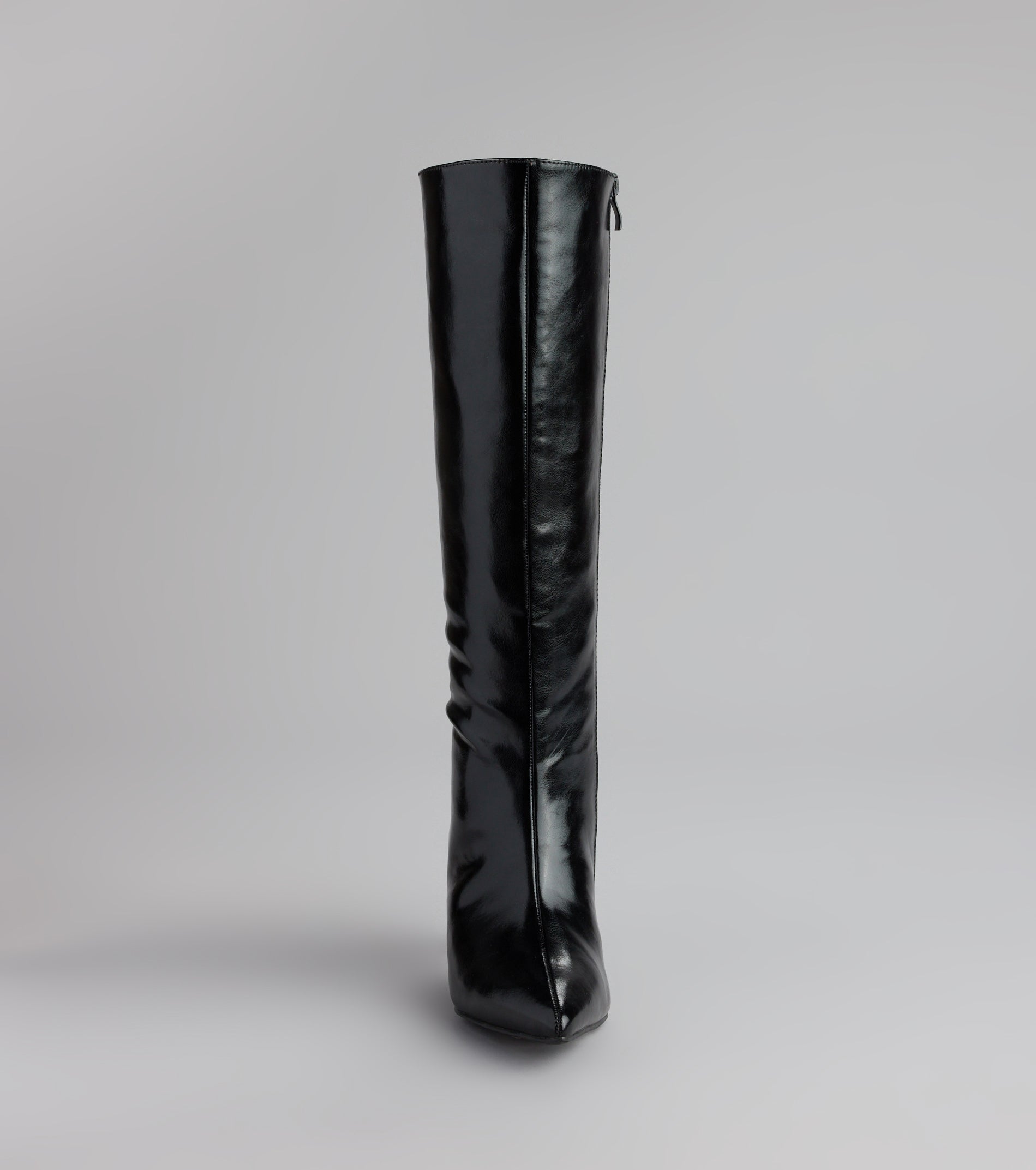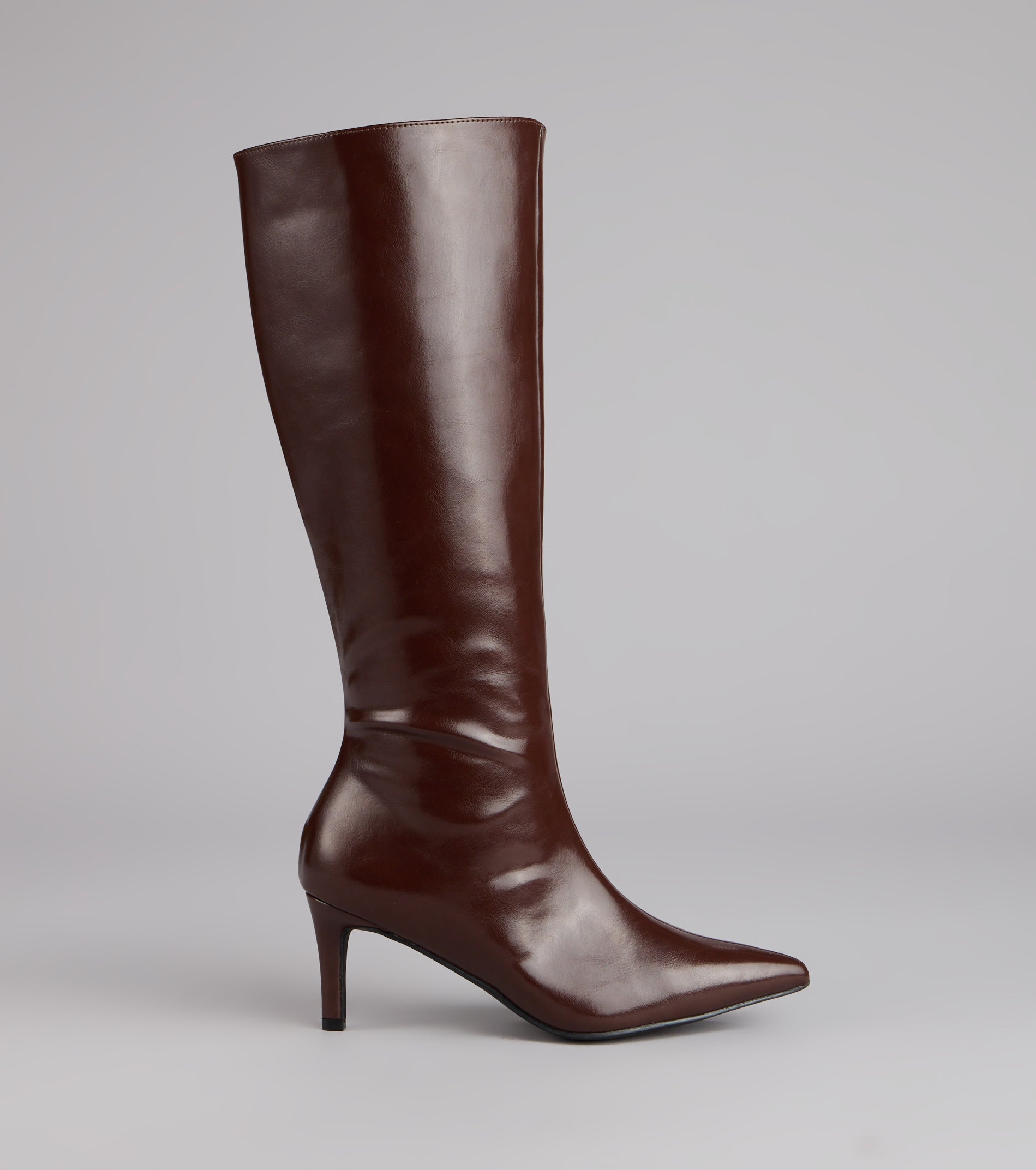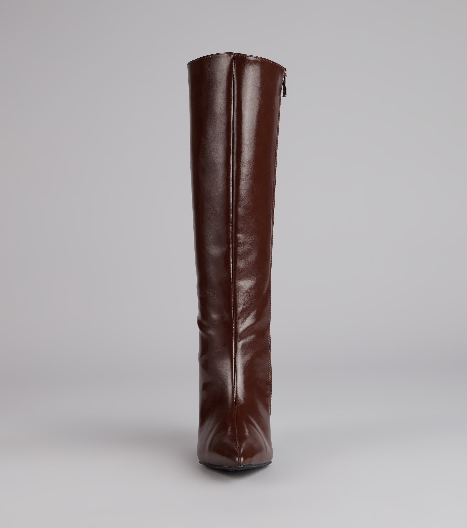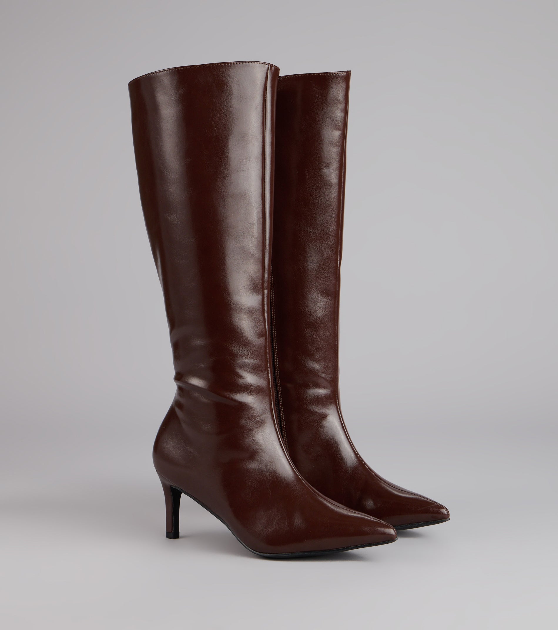 Cold-weather dressing just got elevated. These faux leather boots bring timeless polish with a pointed toe and sleek under-the-knee cut. with a stiletto heel that pairs effortlessly with fall layers.