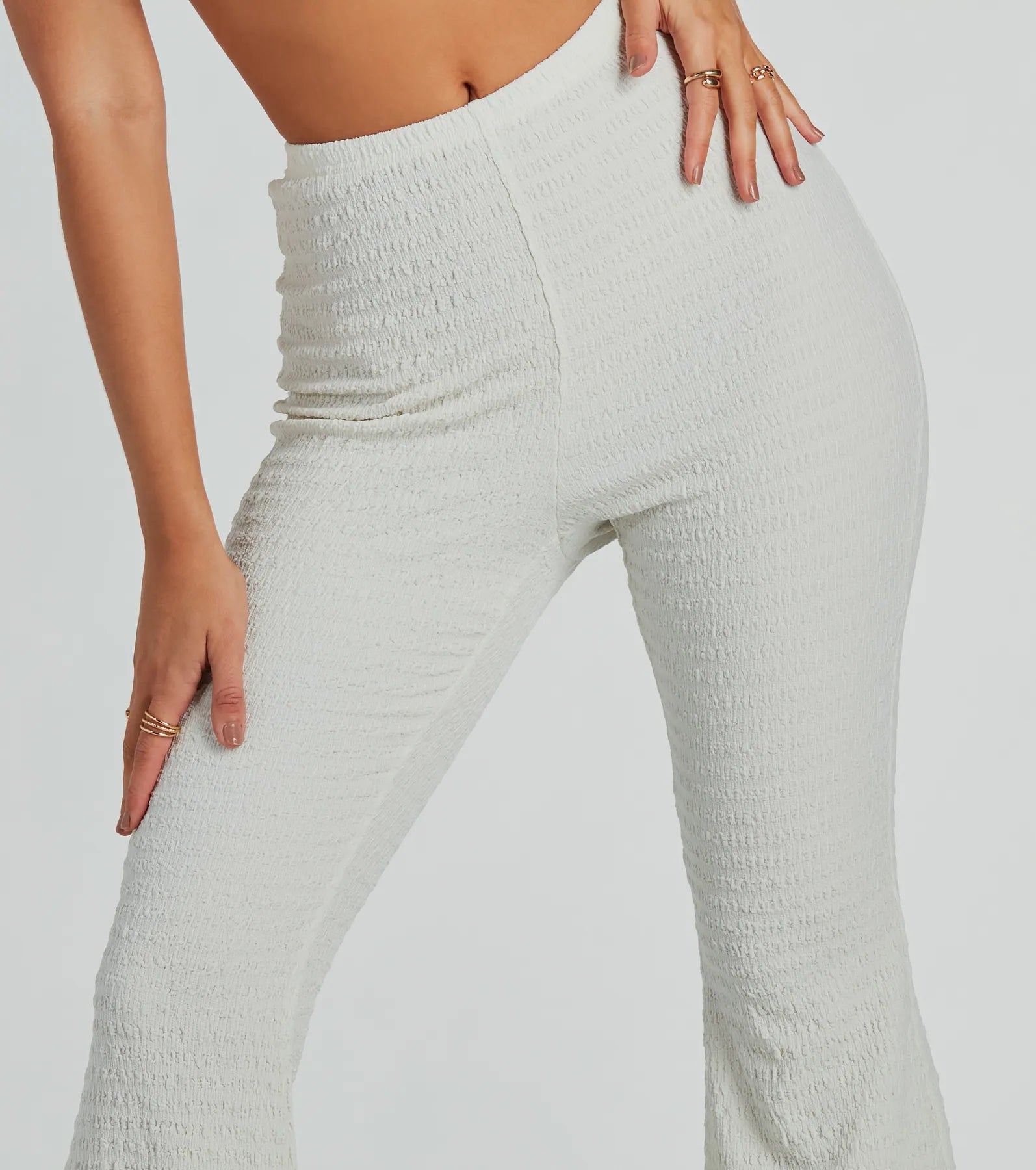 These crinkle knit flare pants will give you those trendy boho vibes you’ve been lusting after! Designed with a crinkle-textured knit fabric. these pants feature a high elasticized waist. a hip-hugging fit that continues through the leg. and a flared hem to add some stylish allure. Complete your bohemian-chic look with the matching top and sandals!