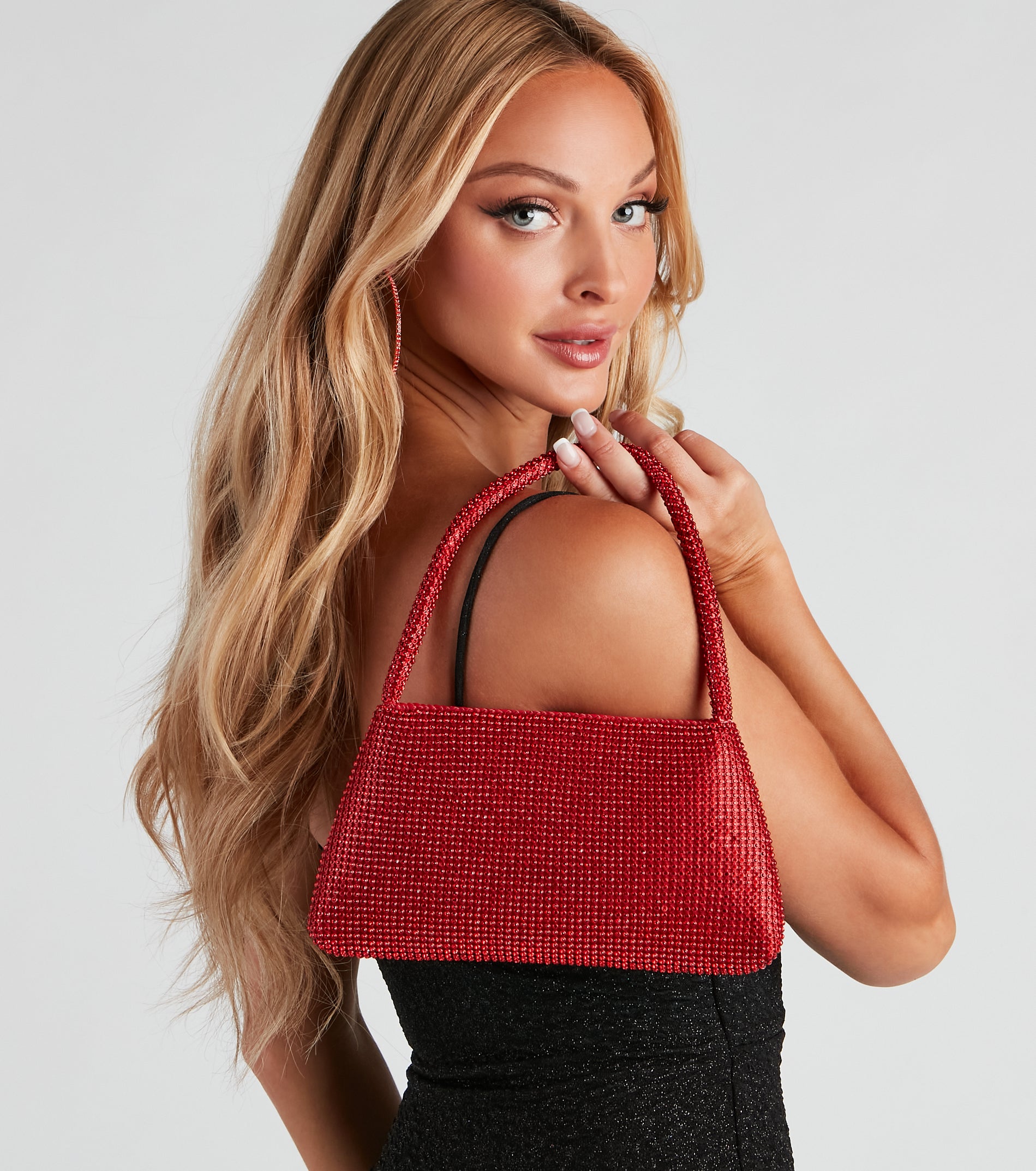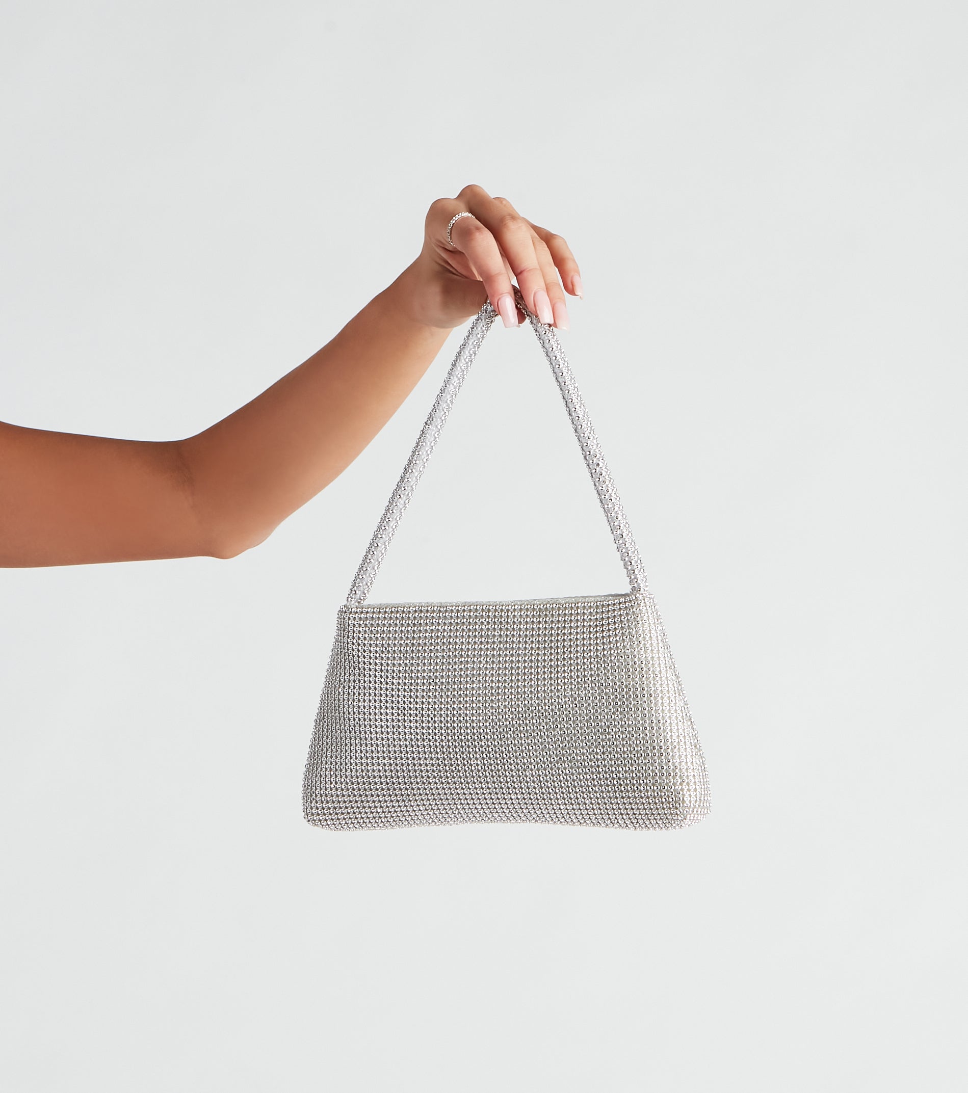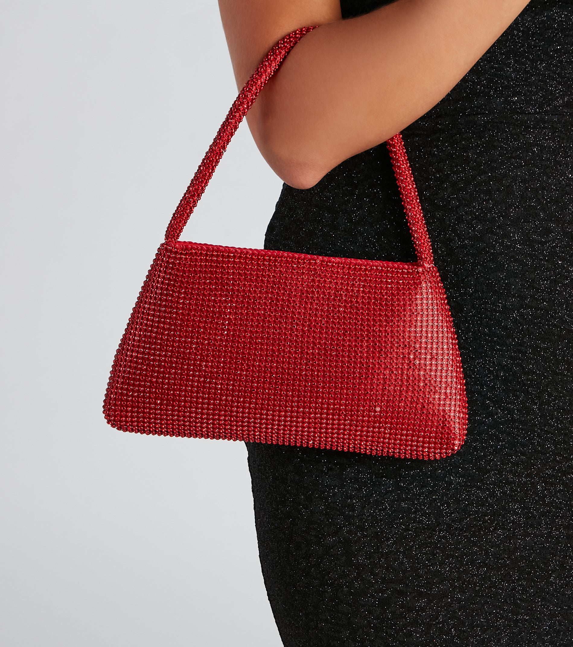 This sparkly and essential shoulder bag is perfect for accessorizing your fit! It features a thin shoulder strap. a spacious satin interior. and a rhinestone mesh material. Complete the look with statement