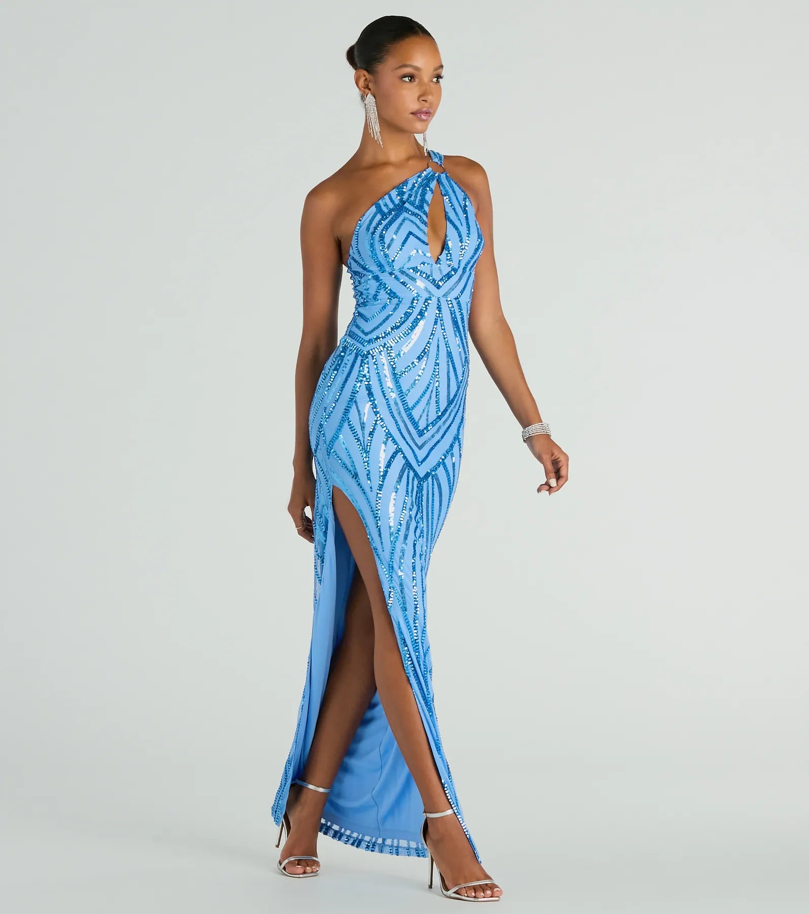 Steal the spotlight in the elegant Stacey sequin formal dress for red carpet events and banquets! Featuring a delicate one-shoulder neckline with a hoop insert shoulder strap a stunning cutout bust. and a sultry curve-hugging slim silhouette. The high side slit and floor-length hem add a touch of sophistication to the dazzling sequin pattern mesh fabric. Complete the look with and sleek heels.