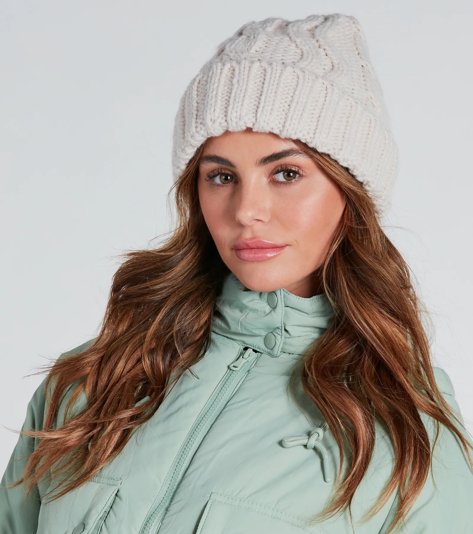 This cable knit beanie has you covered with toasty warmth and style! The cable knit fabric and foldover design make this beanie a stylish addition to any winter look. Complete the look with the matching scarf for a fun winter day!