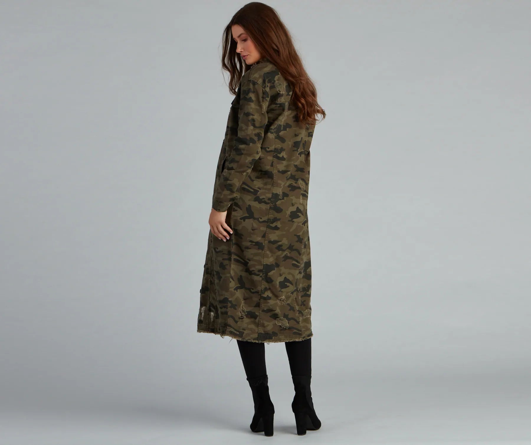 Step up your casual style with this cute long line camo jacket! It features a collared neckline. long sleeves. a complete button-down front. buttoned chest pockets. distressed detailing. and a long line relaxed silhouette with a frayed hem. Layer this jacket over a and complete the look with booties.