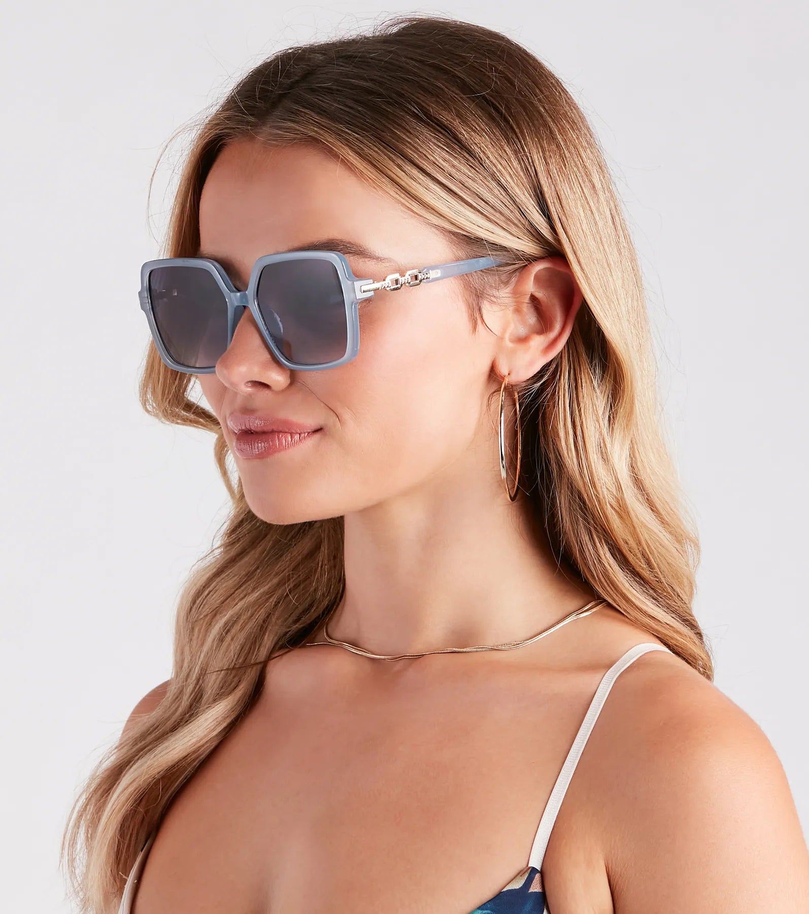 Step up your summer style with these fab oversized sunglasses. They feature a square-shaped oversized design with a clear plastic frame. metal chain-link accents on the arms with mini rhinestone embellishments. and tinted lenses. Pair with a .