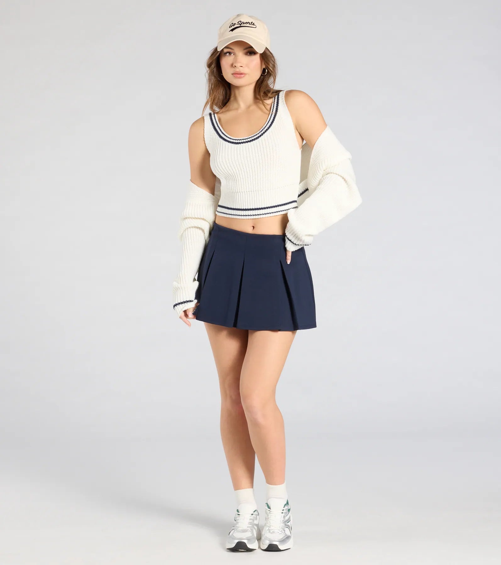 A stylish knit tank top features a striped scoop neckline and fitted crop hem. Complete the look with the matching bolero.