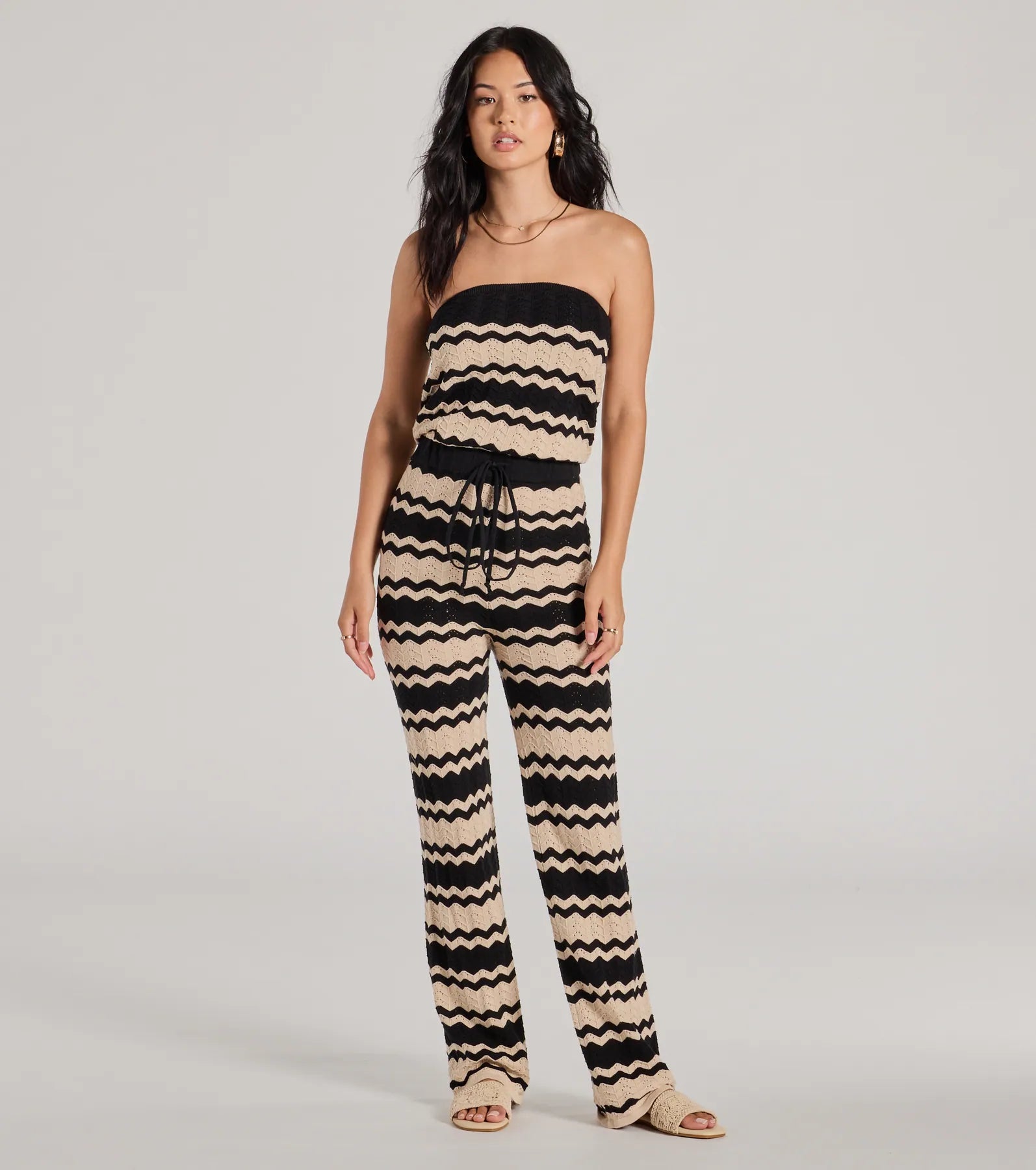 Spend your days looking stylish in this striped jumpsuit perfect for layering over your swimsuit or wearing on its own. The jumpsuit features a strapless neckline and an adjustable drawstring waist that cinches. leading to the flattering wide-leg silhouette. Complete the look with chic .