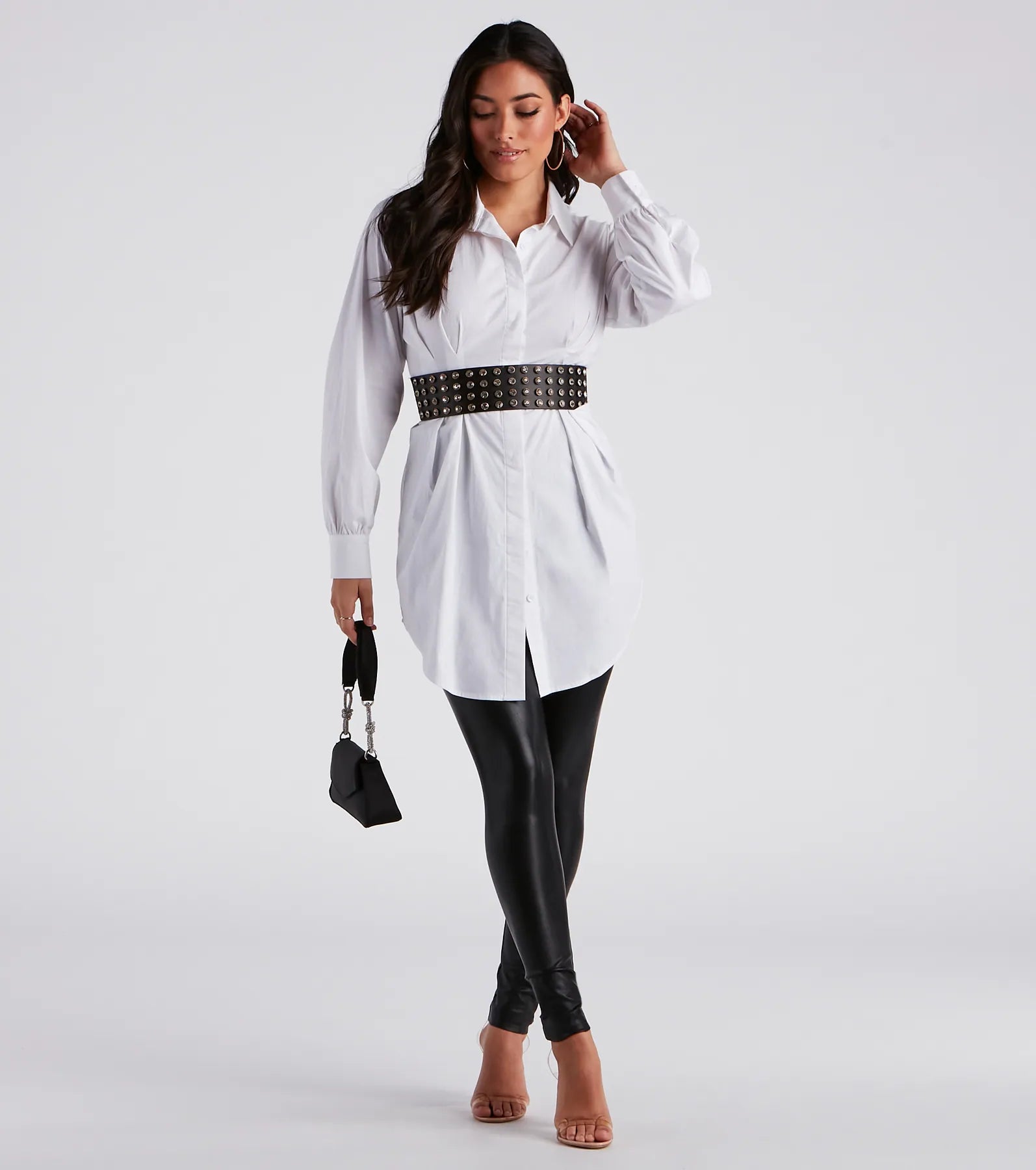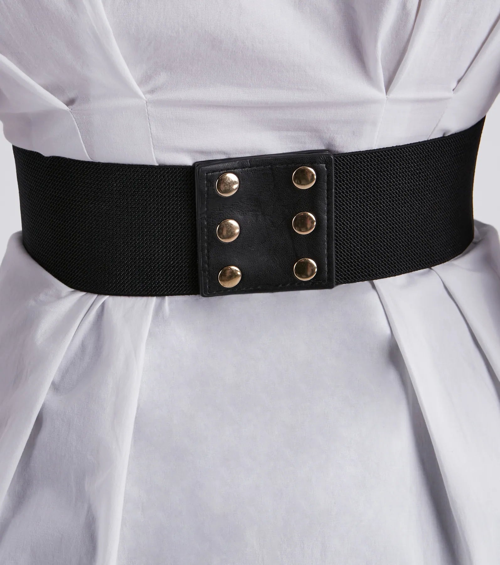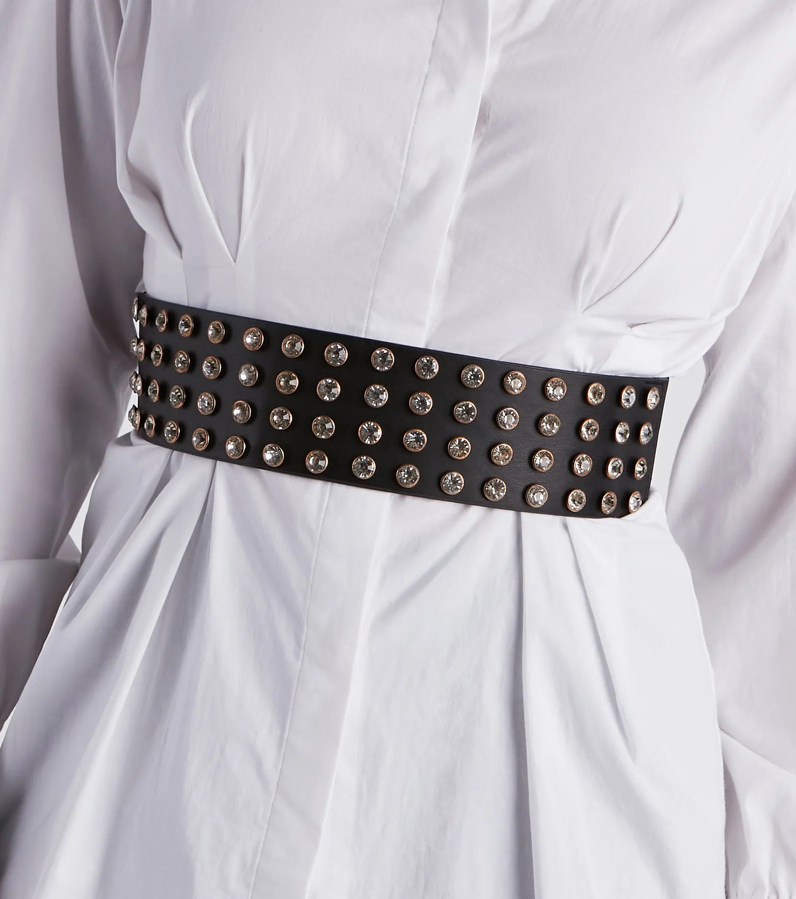 Show up and stun in this gorgeous belt that gives off a stylish shimmer! It features a wide elastic stretch design with a faux leather front with gemstone accents. Includes back button closures. Pair with high-rise dress pants and a chic .