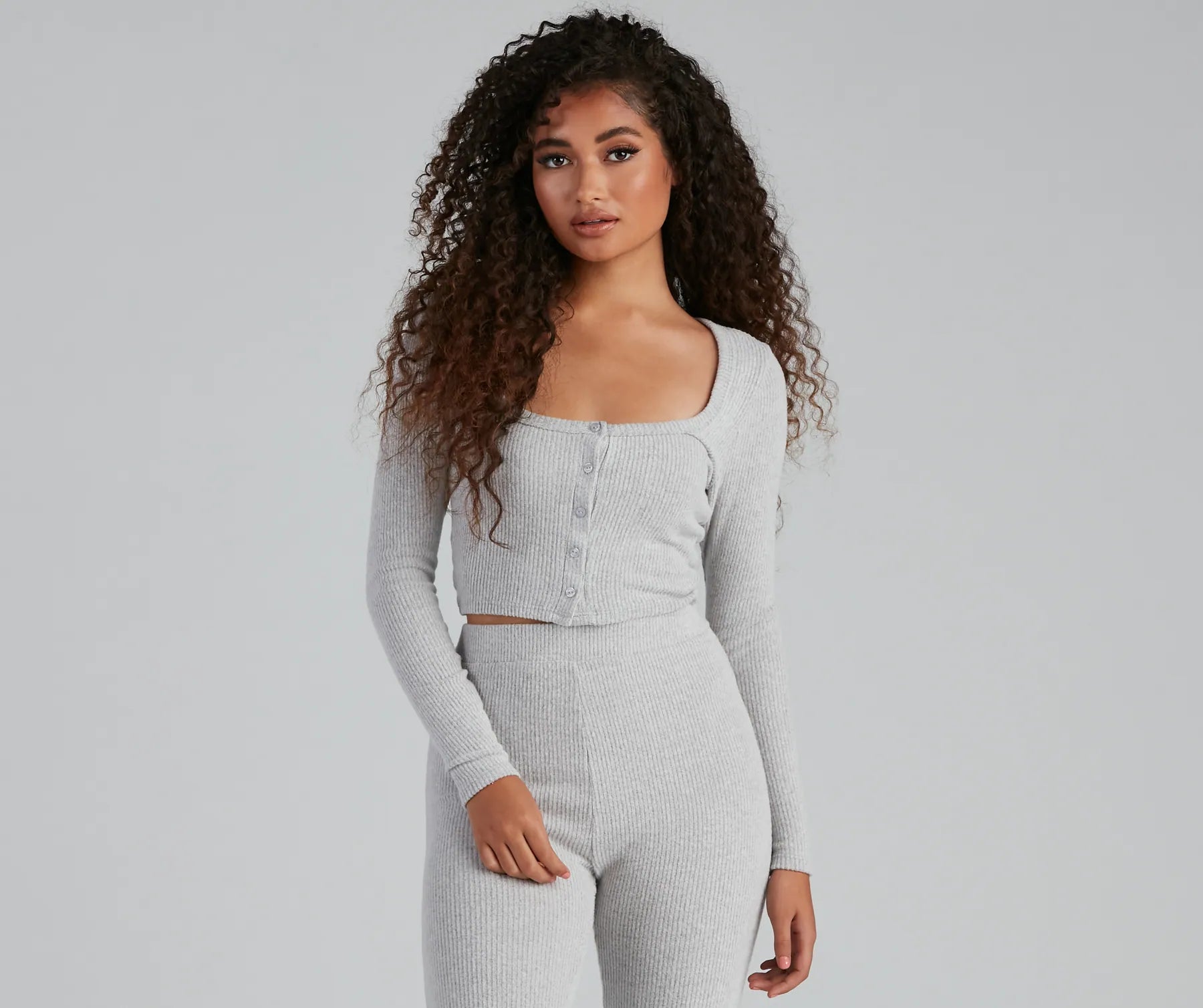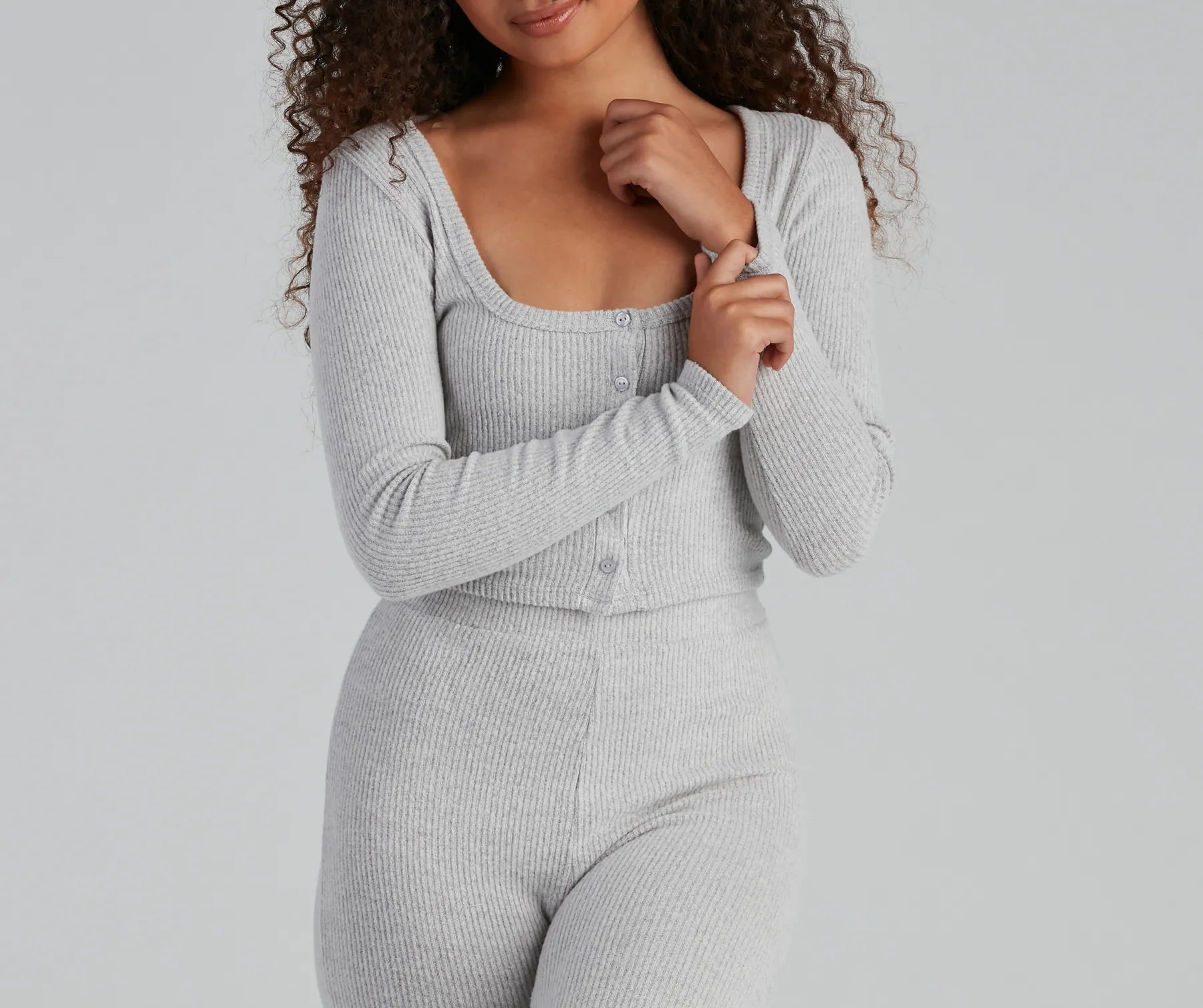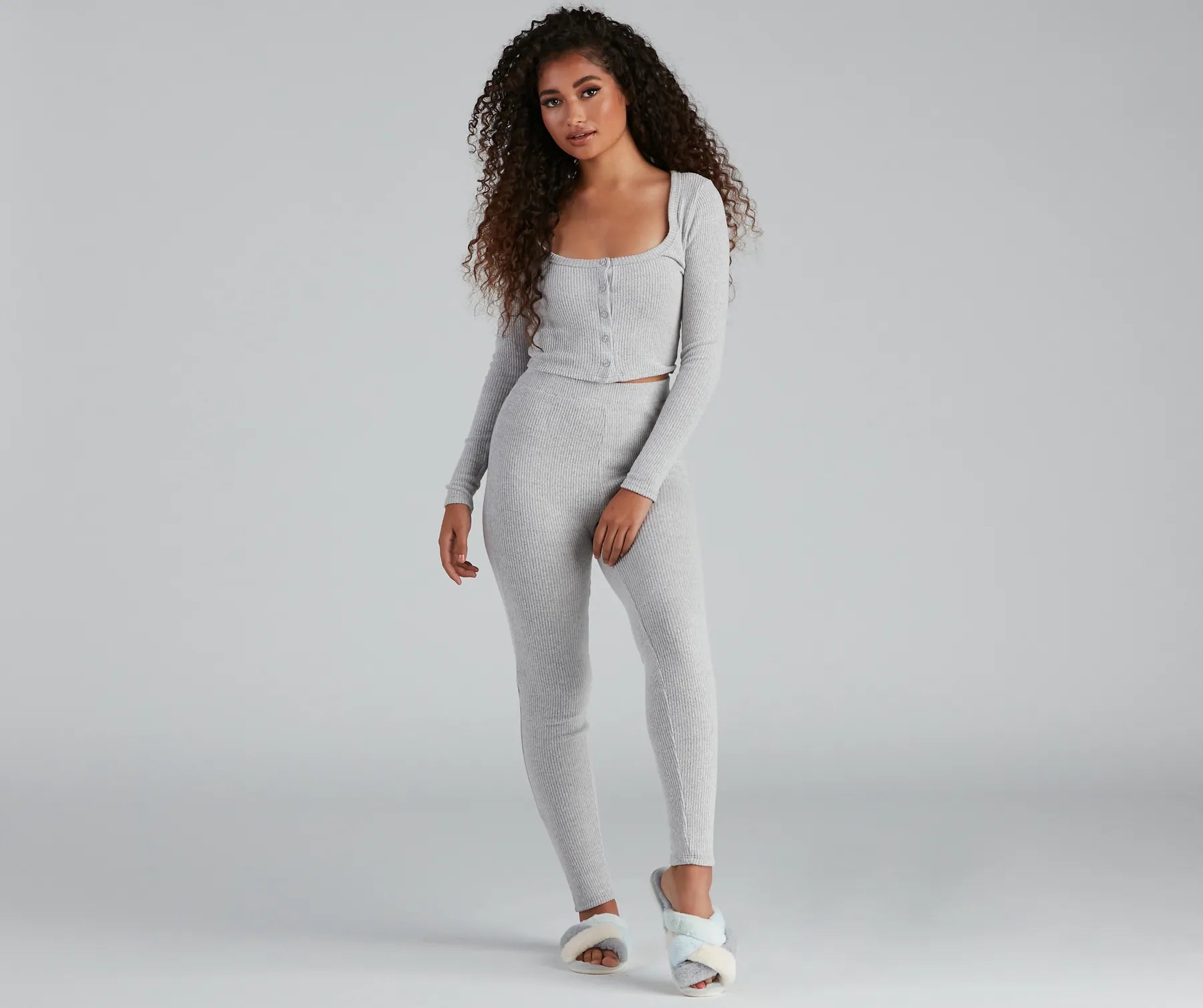 Get stylishly snug in this pajama top for lounging at home! It features long sleeves. a scoop neckline. and a button-down front on a cropped hem. The soft ribbed knit fabric offers a moderate stretch. Complete the look in the matching leggings.