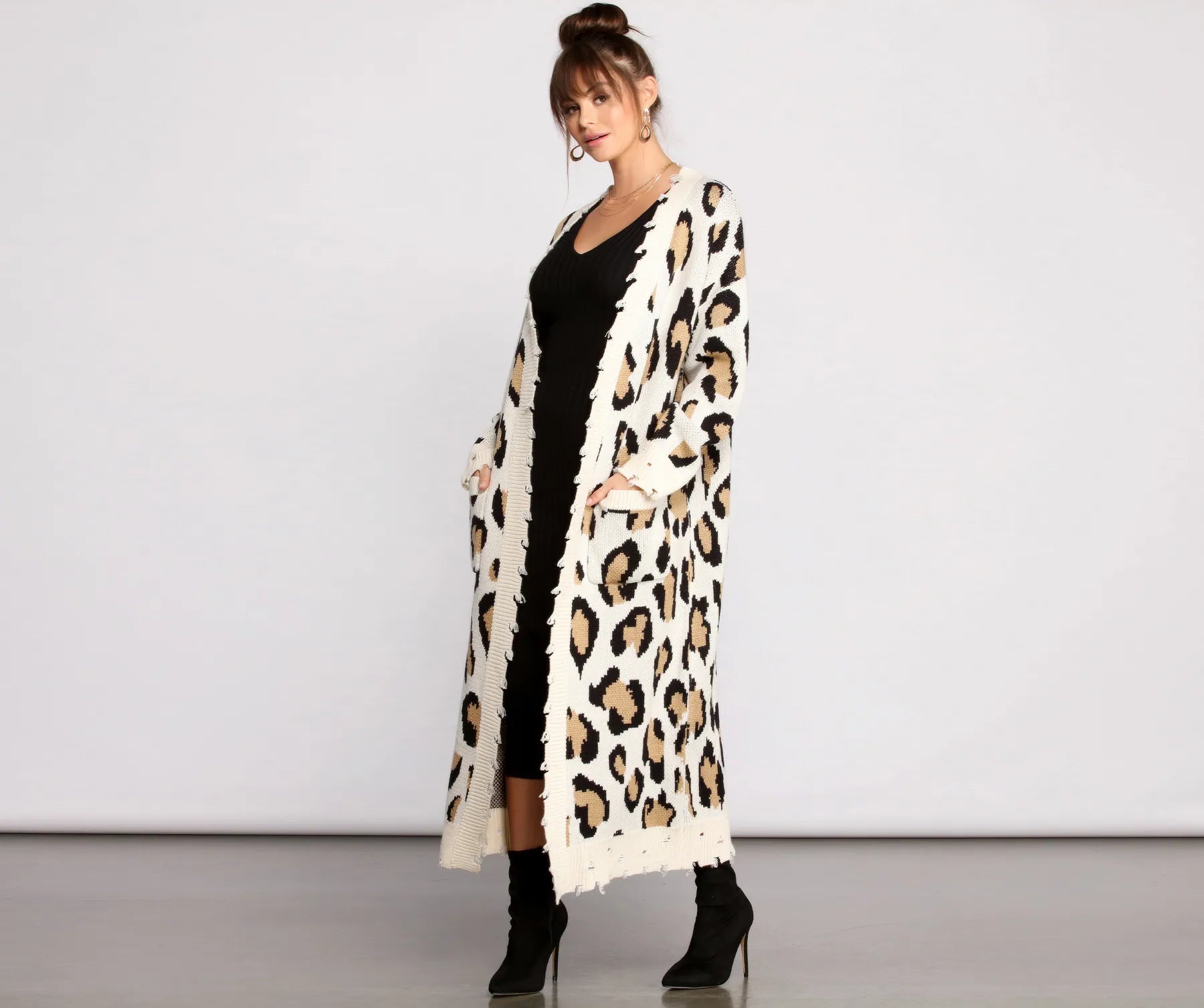 Layer on this stylishly spotted leopard print duster to get a trendy chic look! It features a long flowy fit with a cool distressed hem. Pair over a for an adorable look.