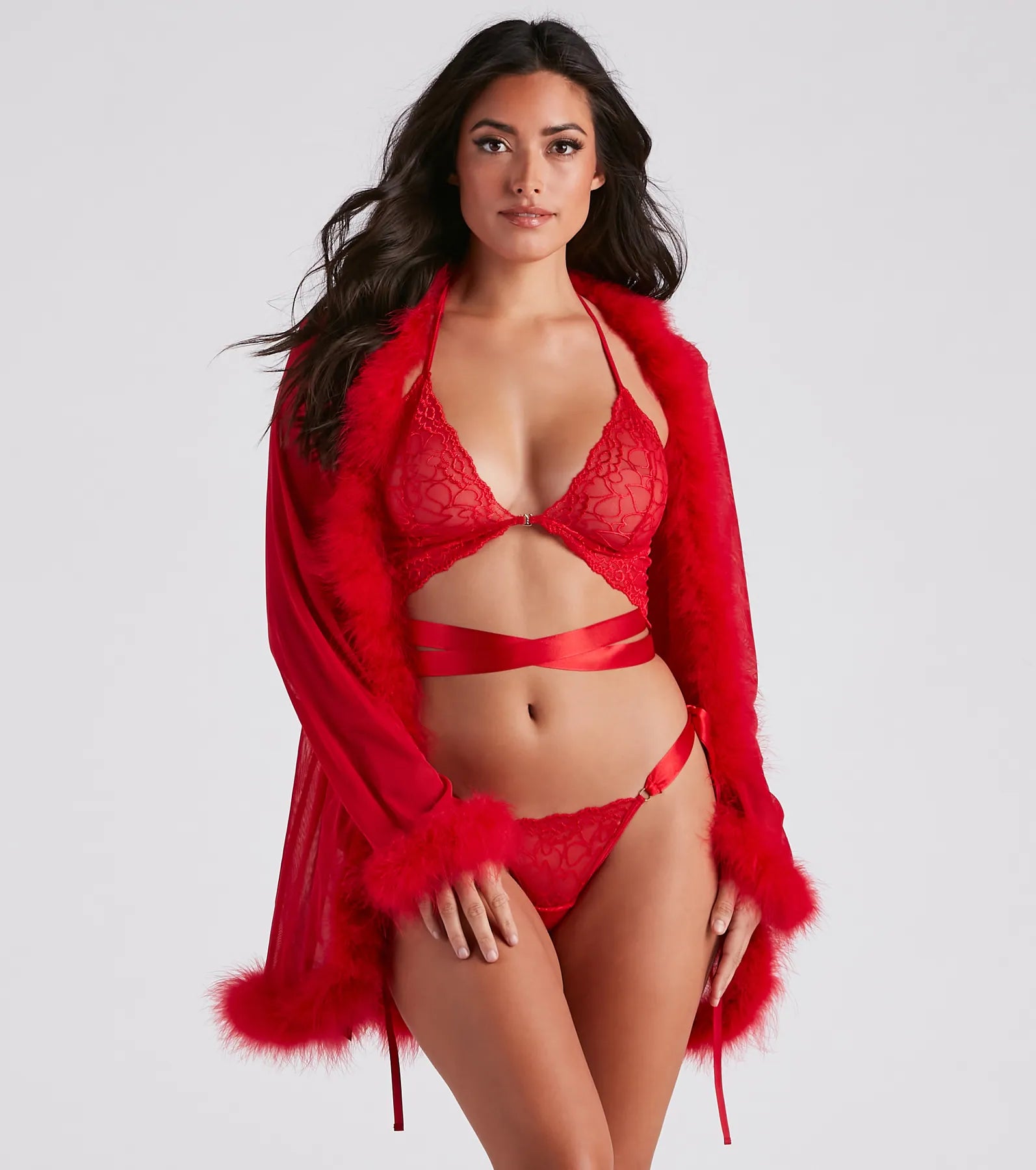 Show off a sultry allure in this seductive bra and panty set! It features a lace bra with a triangle design. halter spaghetti straps. a partially open back. and silky satin straps that wrap around the waist. The matching lace panty features sleek satin straps that tie at each side. a back metal heart accent. and a thin thong strap. The stretchy sheer mesh fabric features an adorable all-over heart pattern. Style with a feather trim robe.