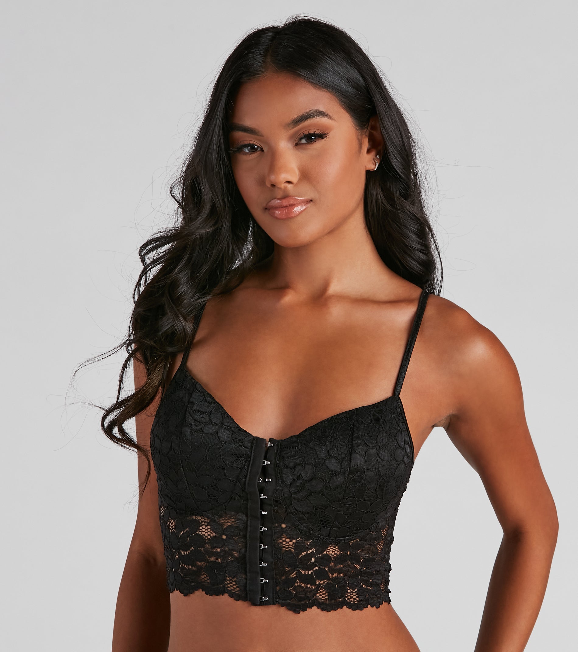 Showcase a sultry and romantic style in this partially sheer lace bralette. It features a sleeveless sweetheart neckline. a padded bust. adjustable spaghetti straps. hook and eye front closures. and a longline hem. Style with a .