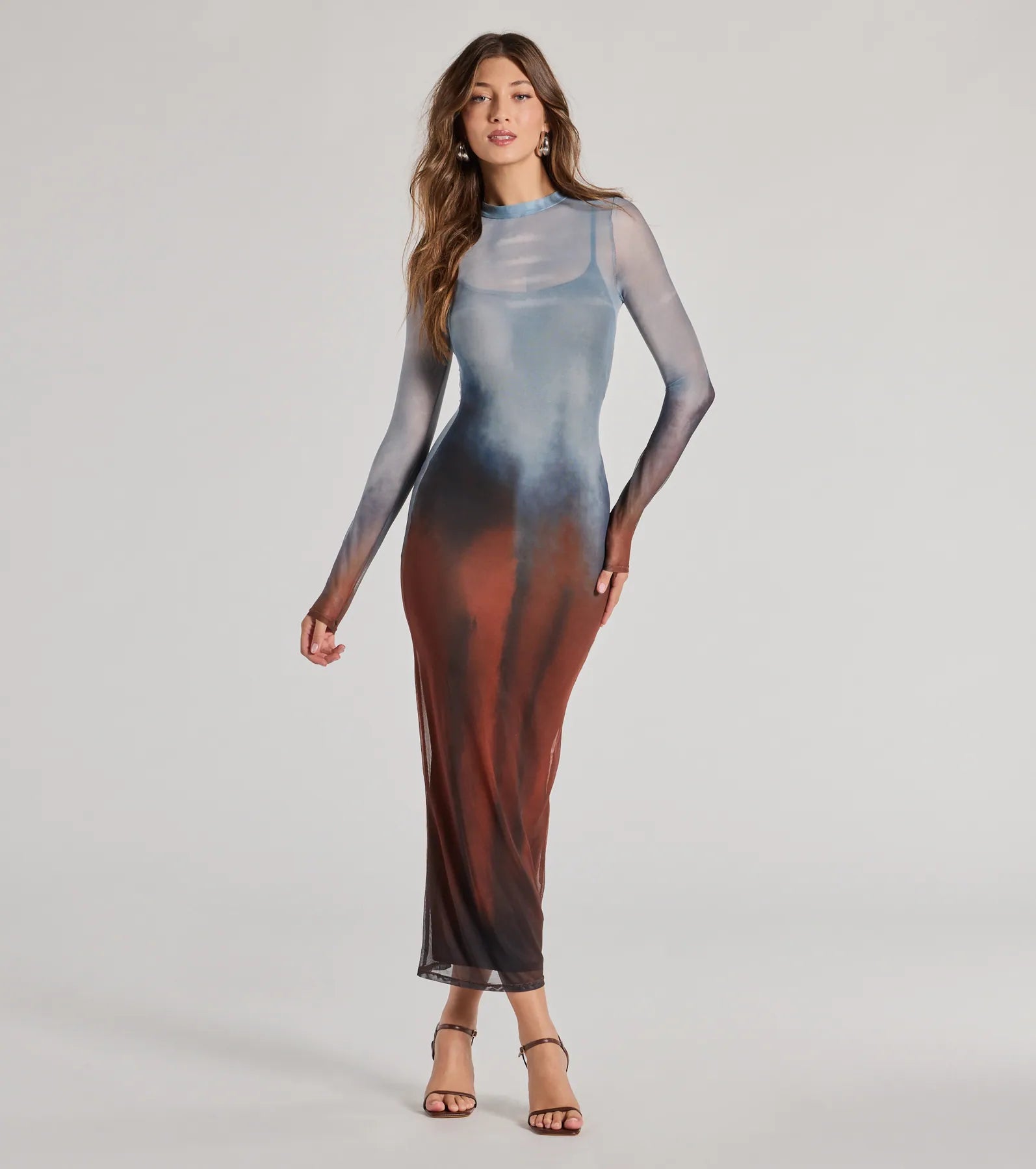 Showcase a sultry silhouette in this sheer mesh midi dress designed with a multi-colored abstract print for a bold vibe. It features a mock neckline with long fitted sleeves. a bodycon silhouette to hug your curves. and a full-length knit lining with a scoop neckline and spaghetti straps.