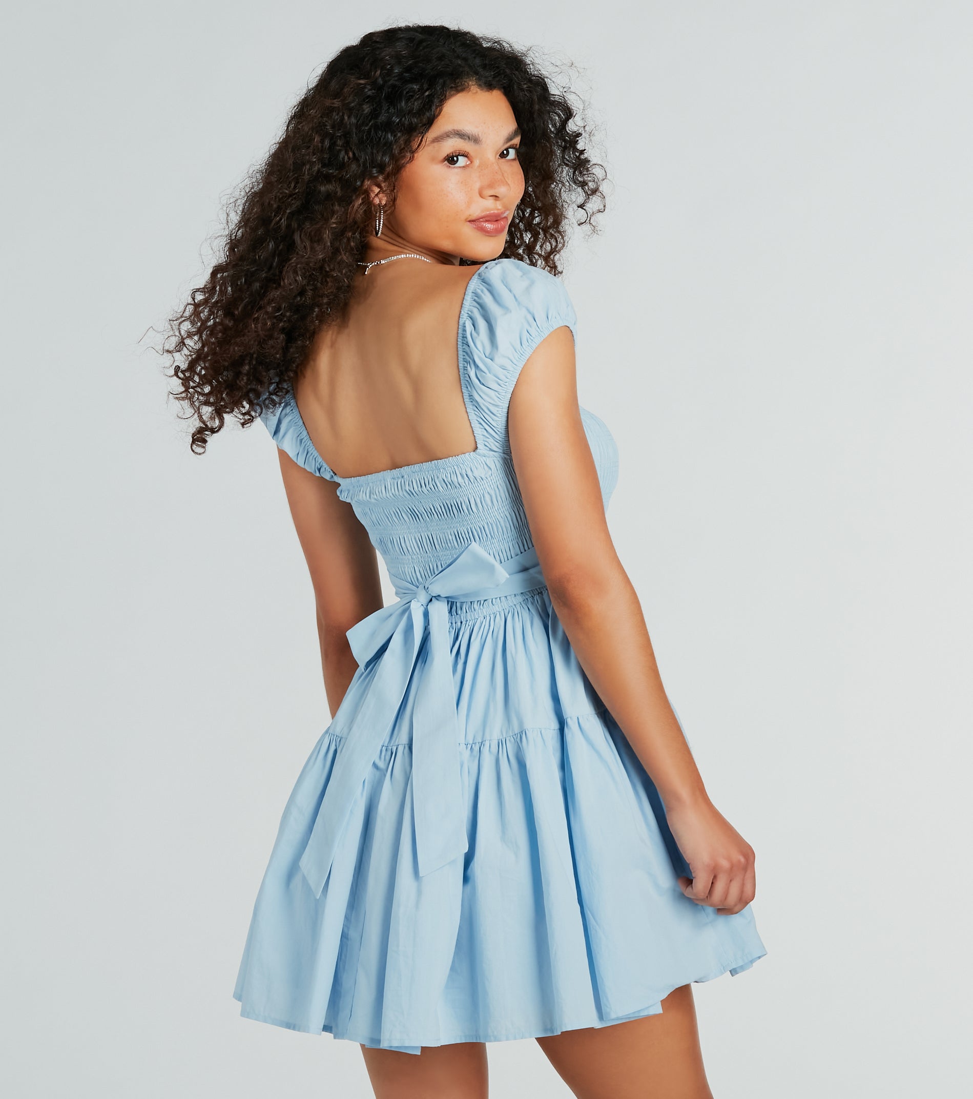 Sunny days pair perfectly with this skater short dress for casual occasions or day dates! Made from lightweight cotton. this dress boasts a square neckline and elasticized cap sleeves for a perfectly feminine touch. The smocked bodice and tie-back waist ensure a flattering fit. while the tiered skater silhouette adds a playful flair. Complete the look with . sunglasses. and a purse for a cute style!