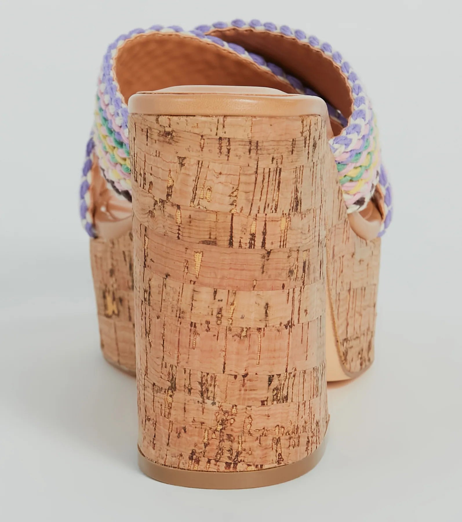 These trendy braided strap platform sandals are perfect for sunset happy hours this season! They feature a cork block heel and platform sole. an open square-shaped toe. and multi-colored braided straps in a criss-cross design. The open back offers effortless on-and-off styling. Pair these sandals with !