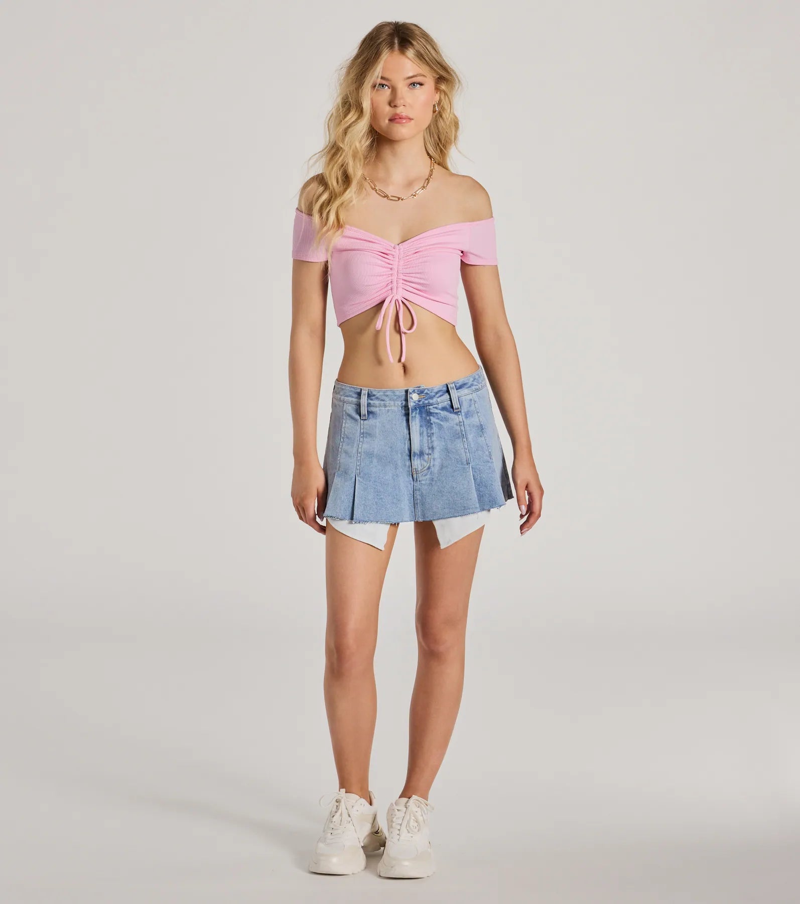 Show off your sweet side in this off-the-shoulder crop top perfect for summer fun! Features a sweetheart neckline and short sleeve cuffs for a flattering fit. The adjustable drawstring allows for a customizable look and the cropped hem adds a touch of trendiness. Complete the look in and sandals for a day out!