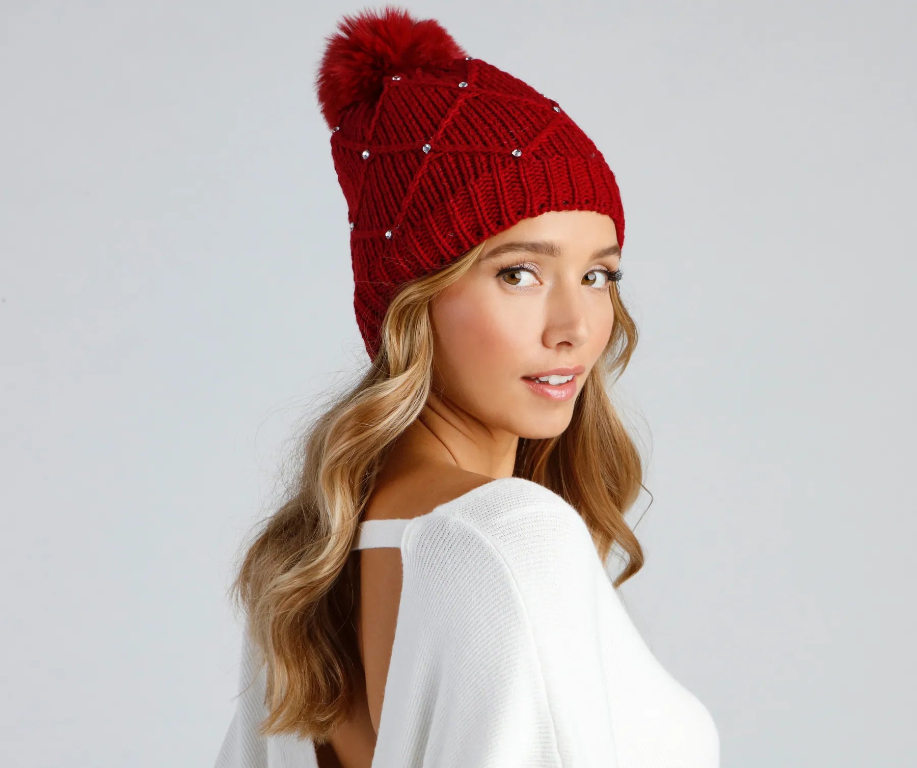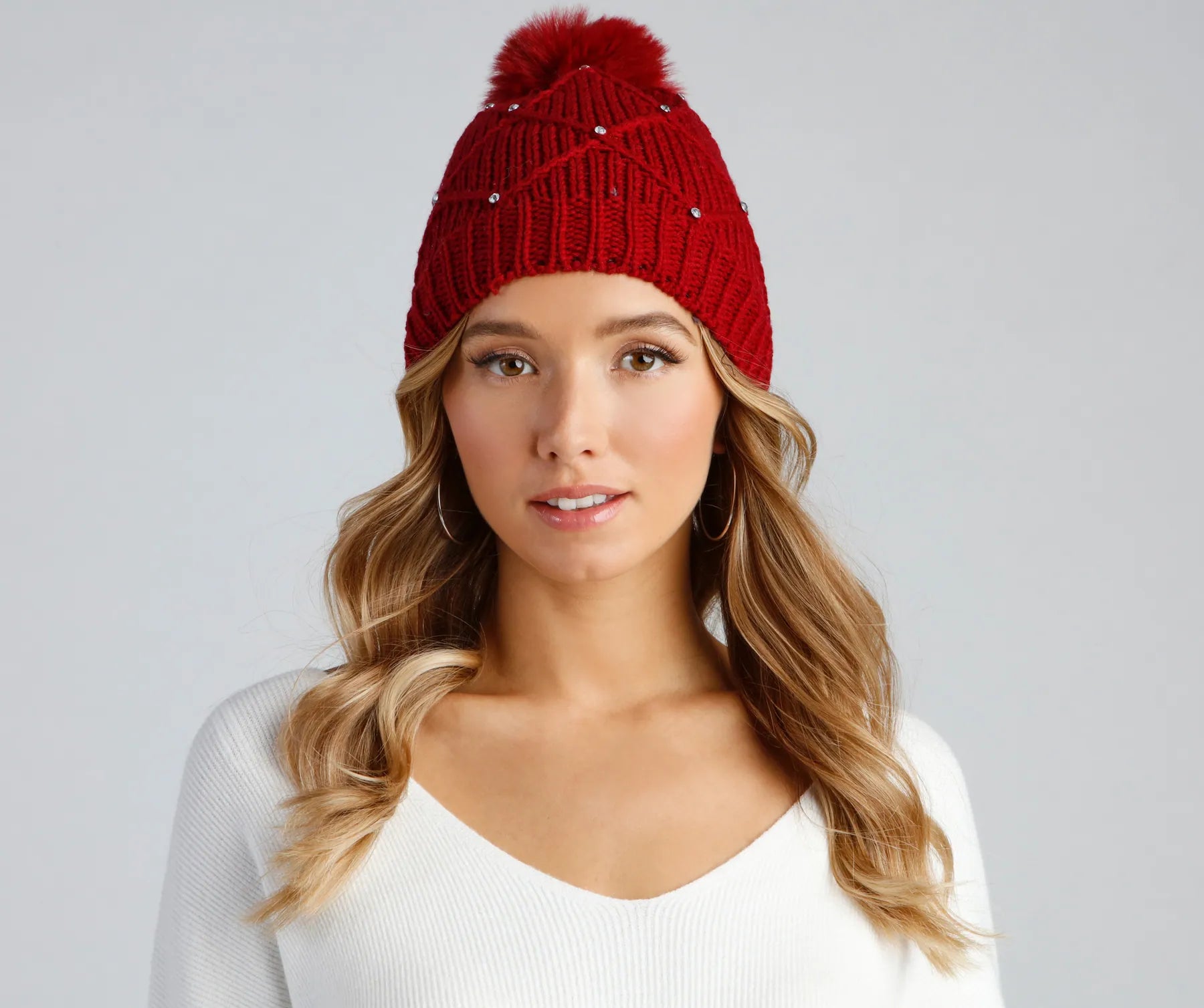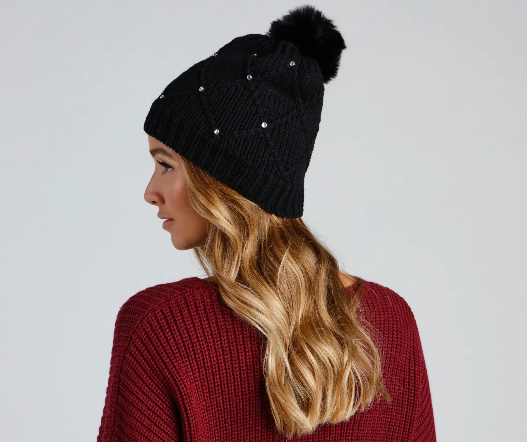 Add sweet sparkle in this rhinestone beanie featuring a faux fur pom. diamond knit design. and sherpa lining for extra warmth.