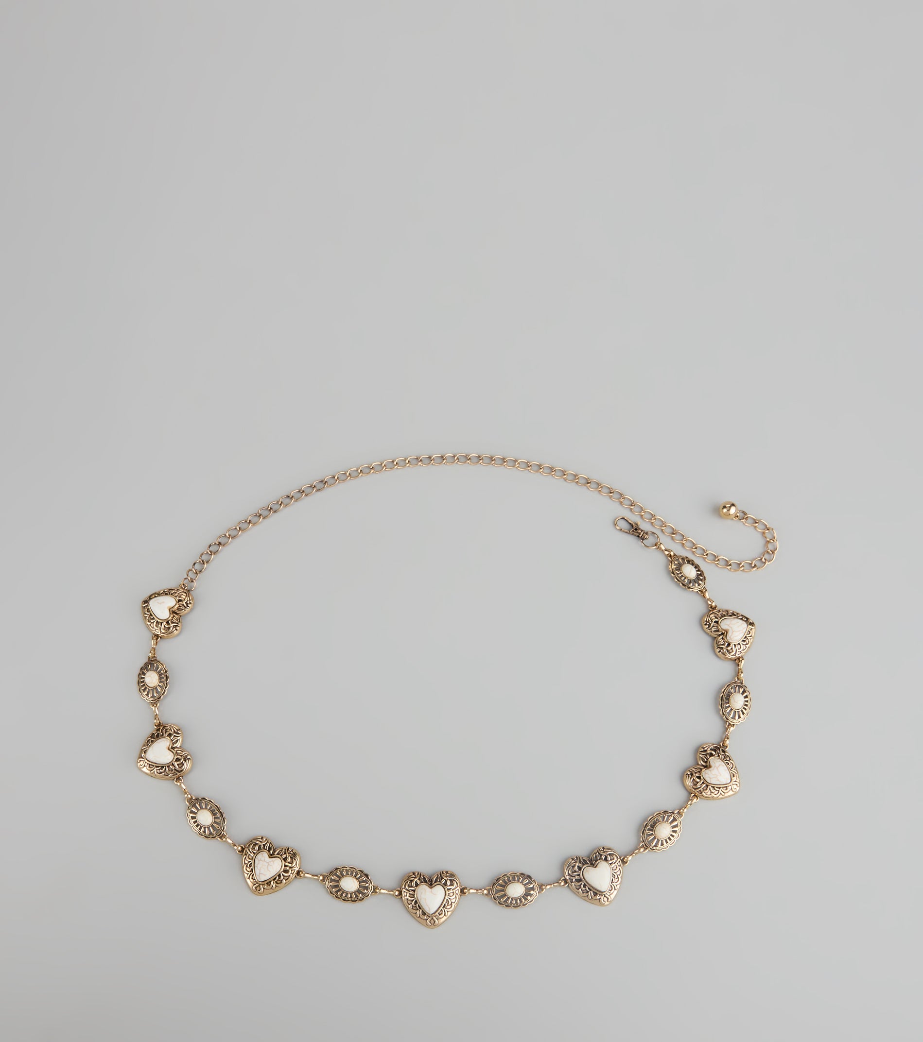 Serving vintage romance with a cool-girl twist. This chain belt with heart-shaped conchos and colored stone insets instantly upgrades denim. dresses. and everything in between.