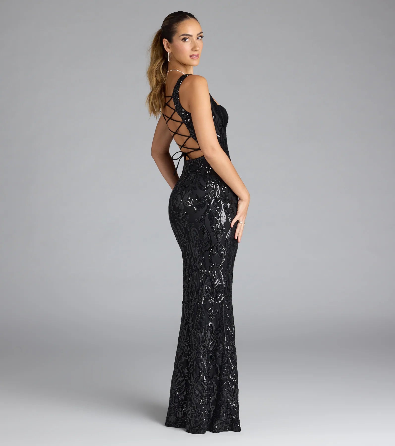 Step into a world of sparkle in the glam Taylor sequin formal dress capturing sultry design details like a lace-up back that turns heads and a high front slit for effortless movement.